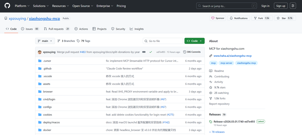 • MCP for 小红书 | 用Claude/Cursor/OpenClaw一句话自动运营小红书,9.7k stars开源项目。