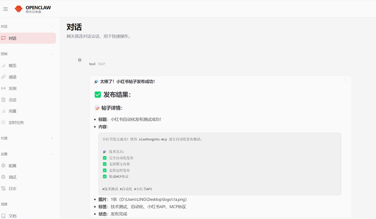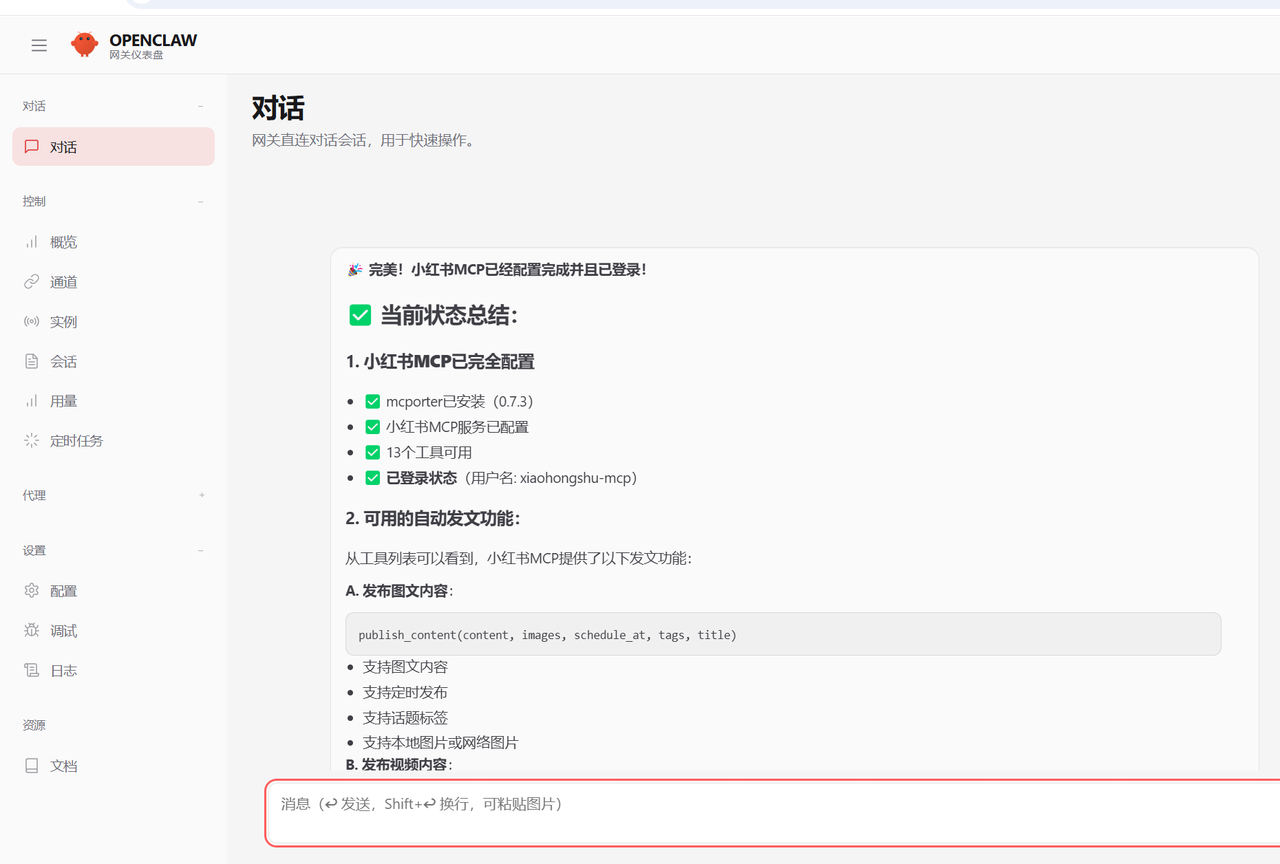 如果返回工具列表(比如 publish_content、check_login_status 等),说明接入成功。完成上述步骤后,即可在 OpenClaw 中通过自然语言调用 xiaohongshu-mcp 的所有功能。