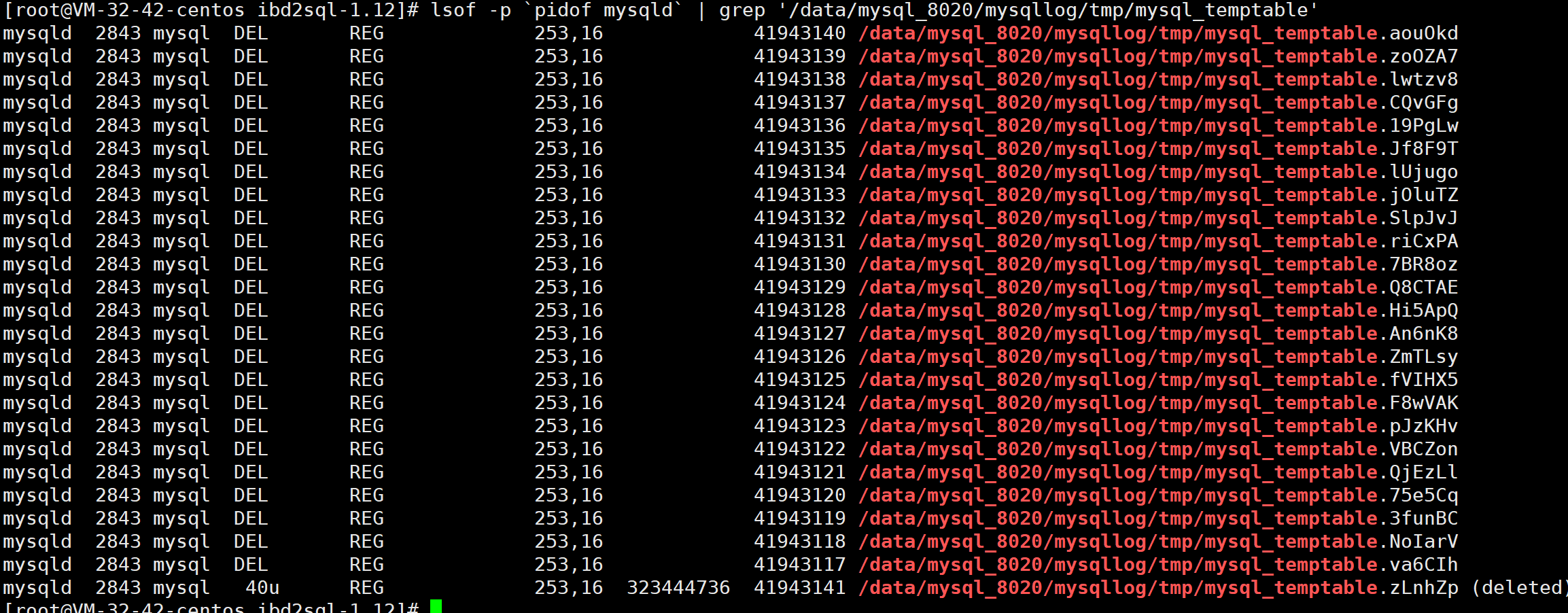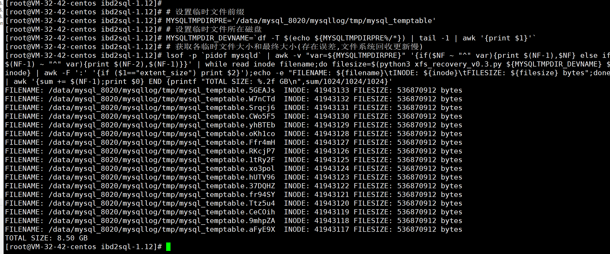 lsof -p `pidof mysqld` | awk -v "var=${MYSQLTMPDIRPRE}" '{if($NF ~ "^" var){print $(NF-1),$NF} else if($(NF-1) ~ "^" var){print $(NF-2),$(NF-1)}}' | while read inode filename;do filesize=$(python3 xfs_recovery_v0.3.py ${MYSQLTMPDIR_DEVNAME} ${inode} | awk -F ':' '{if ($1=="extent_size") print $2}');echo -e "FILENAME: ${filename}\tINODE: ${inode}\tFILESIZE: ${filesize} bytes";done | awk '{sum += $(NF-1);print $0} END {printf "TOTAL SIZE: %.2f GB\n",sum/1024/1024/1024}'