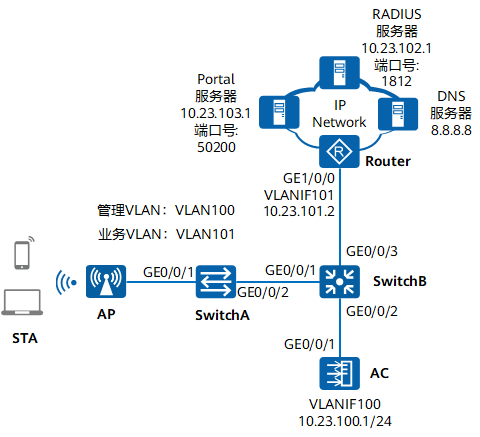 图1 配置WLAN外置Portal认证示例组网图