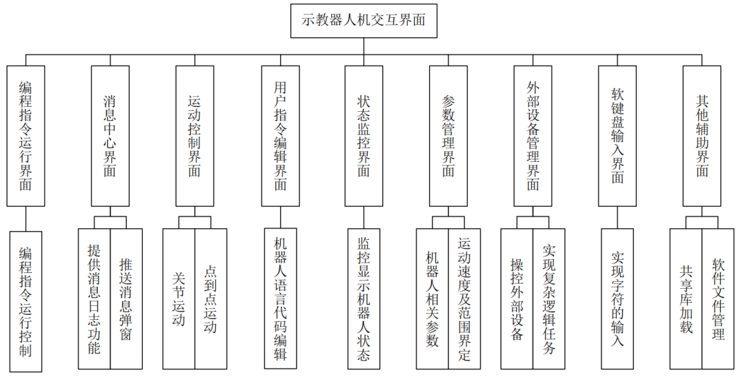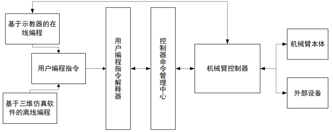 用户编程指令对机械臂的控制,需要设计一个用户编程指令解释器将其转化为控制器中的命令格式。由解释器转化生成的控制器命令将存储于示教系统软件的管理中心当中,通过管理中心可以实现用户编程指令代码的在线调试工作。