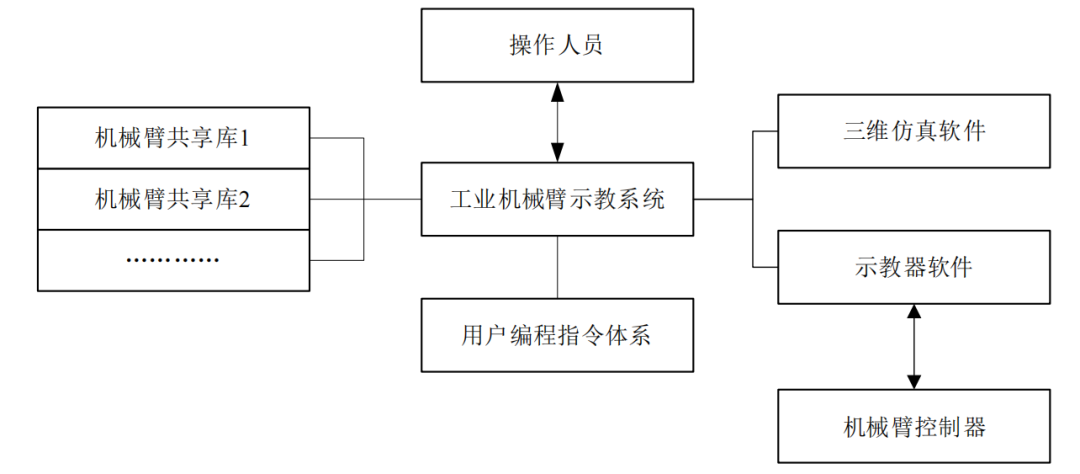 示教系统包括两款软件,其中示教器软件负责连接工业机械臂控制器进行在线编程工作,而三维仿真软件则负责和工业机械臂模型交互实现离线编程的目的。在示教系统中需要提供一系列的共享库文件辅助软件的计算工作,除此之外还需要设计一套用户编程指令体系,在这两者的支持下两款示教编程软件才能完成各自的工作。