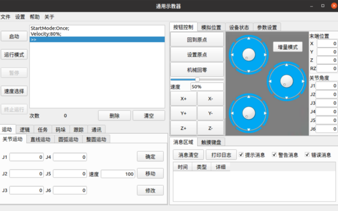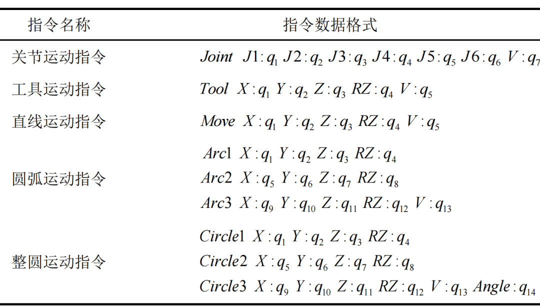 运动控制指令是用户编程指令中最基本的部分,主要通过定义关节的运动和末端执行器的运动来实现运动控制的目的,运动控制编程指令主要包括关节运动指令、工具运动指令、直线运动指令、圆弧运动指令和整圆运动指令等。