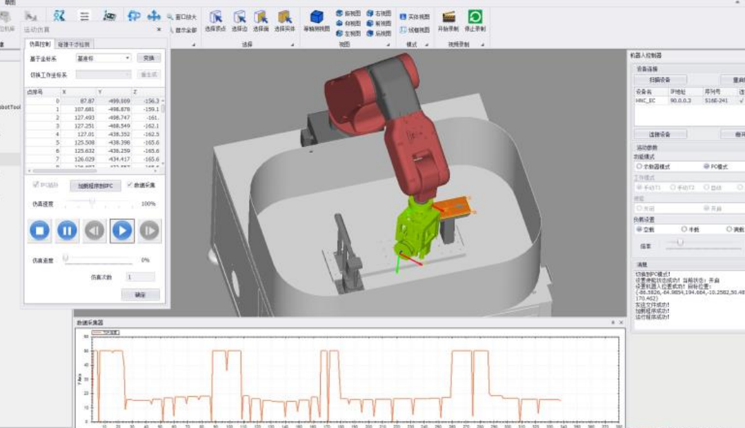 除了上述基于机械臂控制器实现的在线编程方案,还有基于三维仿真界面实现的离线编程方案,离线示教和在线示教的区别在于示教系统在示教运动、数据获取、指令编程阶段脱离了机械臂本体及其控制器。在离线示教中,操作人员无法直观的看到机械臂本体的运动姿态,所以需要由离线示教系统提供的三维场景和机械臂模型来辅助示教操作人员的工作,在图形界面的三维场景之中,示教系统将模拟实际生产的工作环境,而操作人员的控制对象也由机械臂结构本体转为三维的机械臂模型。