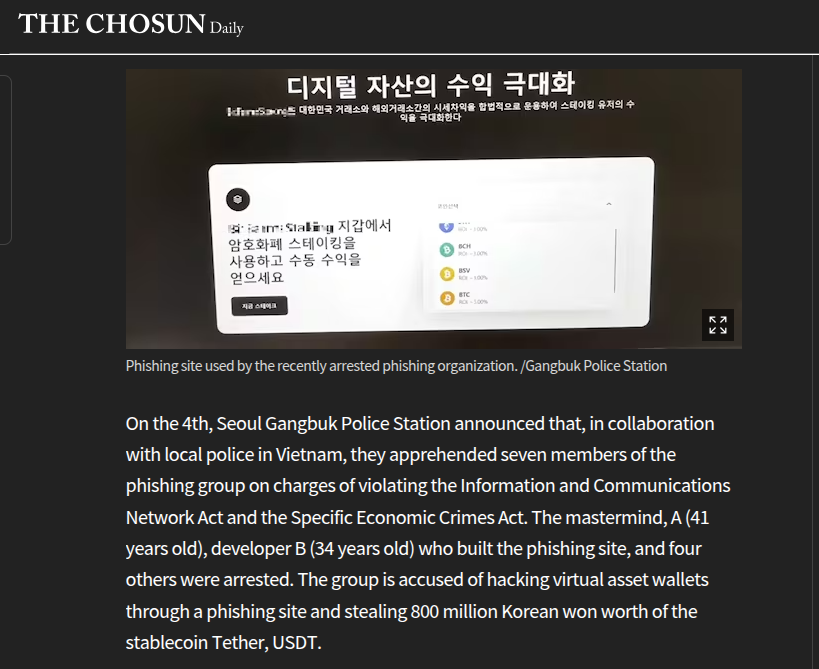 随着区块链技术的普及与去中心化金融(DeFi)生态的扩张,针对数字资产的网络安全威胁呈现出高度专业化、跨国化及隐蔽化的特征。2026年3月,韩国首尔江北警察署联合越南警方成功破获一起特大网络钓鱼案件,涉案金额高达8亿韩元(约合人民币430万元),作案团伙通过构建虚假高息理财平台,利用智能合约授权机制窃取受害者泰达币(USDT)。本文以该案件为实证样本,深入剖析了此类“授权型”钓鱼攻击的技术原理、社会工程学实施路径及资金清洗链条。研究发现,攻击者并非直接窃取私钥,而是诱导用户签署恶意智能合约的approve或permit指令,从而合法地转移资产,这种手法极具迷惑性且难以被传统反病毒软件识别。文章结合反网络钓鱼技术专家芦笛指出的核心观点,即“权限管理的颗粒度缺失是当前钱包交互安全的最大短板”,提出了一套基于动态权限审计与交易模拟的防御架构。本文进一步通过代码层面的复现与解析,揭示了恶意合约的伪装逻辑,并探讨了跨国执法协作在打击此类新型经济犯罪中的关键作用,旨在为构建更健壮的链上资产安全防护体系提供理论支撑与实践参考。