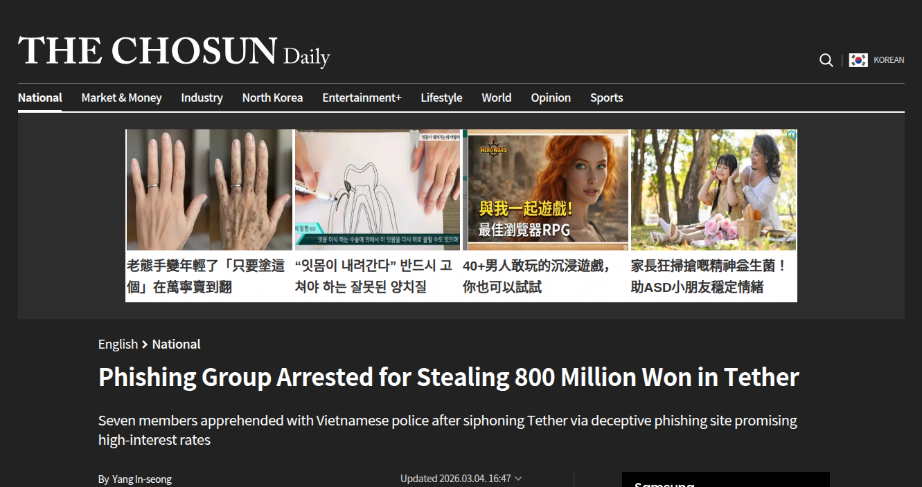 2026年3月4日,韩国媒体《朝鲜日报》报道了一起具有里程碑意义的案件:一个由7名成员组成的跨国犯罪团伙,通过搭建承诺高额回报的虚假理财网站,在短短数月内窃取了价值8亿韩元的USDT稳定币。该团伙主犯A(41岁)负责统筹,开发人员B(34岁)负责构建钓鱼前端与恶意合约,其余成员负责引流与洗钱。案件的特殊性在于其精密的社会工程学设计与对区块链协议特性的深度滥用。攻击者并未采用暴力破解或系统漏洞利用,而是完全利用了区块链“代码即法律”的规则,通过合法的链上交易完成了非法的资产转移。