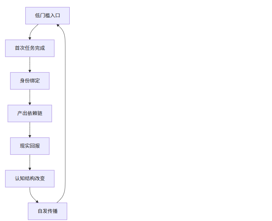 这套架构的核心逻辑是:通过低门槛任务吸引新成员,通过身份绑定和产出依赖增加成员离开成本,通过现实回报和认知结构改变实现精神同化,最终通过成员自发传播实现社区的自我复制和增长。