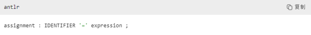 以上名为 assignment 的语法规则中所包含的大写字母序列 IDENTIFIER 被称之终结符,它来自词法分析器,我们在词法规则中会对其进行定义。