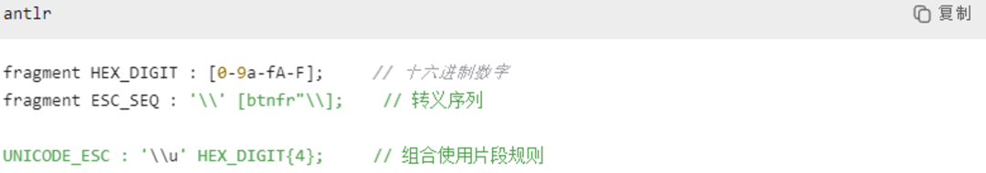 将一条规则声明为 fragment 可以告诉 ANTLR,该规则本身不是一个词法符号,它只会被其他的词法规则使用。这意味着我们不能在文法规则中引用 HEX_DIGIT。