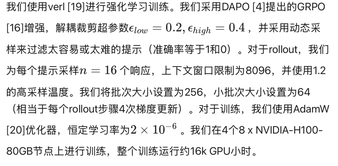 为了实现有效的长程强化学习,我们使用从评估基准派生的混合验证集来监控训练进度。当验证性能停滞或下降时,我们对参考模型和优化器执行硬重置。这不仅恢复了训练稳定性,还促进了策略与基础模型的更大发散。在训练的大部分时间里,我们将响应长度限制在8k token以保持简洁和稳定的生成。在最后阶段(约200步),我们将上下文窗口增加到16k token,观察到模型快速适应并实现了可测量的改进。我们在附录E中详细介绍了我们的训练方案。