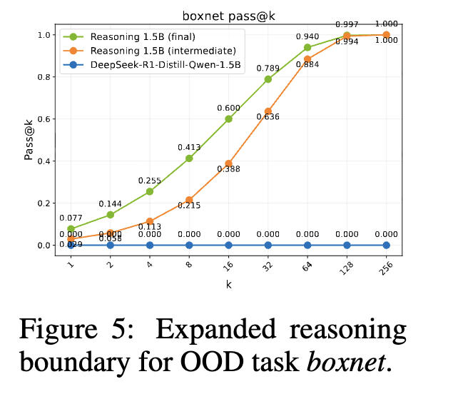 分布外(OOD)任务 我们在训练期间未见过的Reasoning Gym任务boxnet上评估模型。如图5所示(示例见附录C.3),基础模型表现出无法解决该任务的能力。相比之下,使用ProRL训练的模型展现出显著的问题解决能力,表明模型的推理边界明显扩展,能够泛化到训练期间未见的分布外任务。此外,当比较中间RL检查点与最终延长RL模型时,我们观察到延长训练在所有k值上持续保持并放大了性能收益。这些结果进一步支持了ProRL使模型能够内化抽象推理模式的结论,这些模式能够泛化到特定的训练分布或复杂度水平之外。