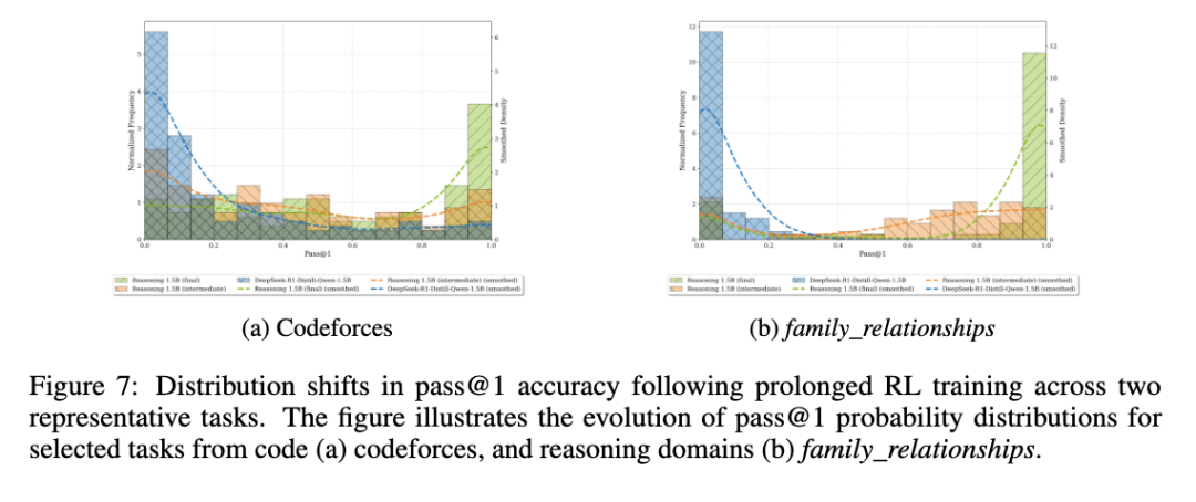 表示任务 x 的 pass@1 准确率。虽然提高预期 pass@1 会提升这个上界,但更高的方差会降低它。与[14]观察到的训练期间 pass@k 下降相反,我们在图1中的结果显示 pass@1 和 pass@16 均持续改进,复现了 OpenAI O1 RL 训练[42]中报告的扩展定律模式。我们的 ProRL 方法在多样化任务中产生了显著的性能提升。图7(a)和7(b)展示了编程和逻辑谜题任务中显著的分布右移。最初集中在零附近且具有长尾分布的 pass@1 分布在训练后发生了显著演变。Codeforces 问题在训练后表现出更广泛的分布模式,而 family_relationships 任务(示例见附录C.2)作为一种新颖的推理挑战,展示了从主要为零准确率到峰值达到完美准确率的戏剧性转变,表明在大多数提示上成功发现了解决方案。这些由延长 RL 训练驱动的显著分布变化,在预期 pass@1 方面产生了足够的改进,以克服方差增加带来的任何负面影响。