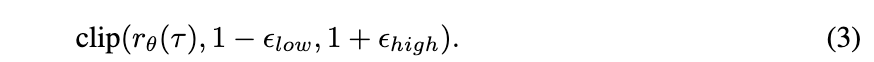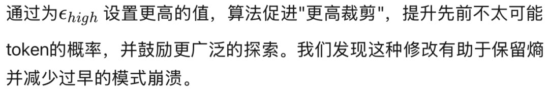 为了解决熵崩溃问题,我们采用了DAPO算法 [4] 的几个组件,这些组件专门设计用于维持探索和输出多样性。首先,DAPO引入了解耦裁剪,其中PPO目标中的下裁剪界和上裁剪界被视为独立的超参数: