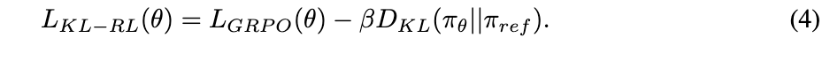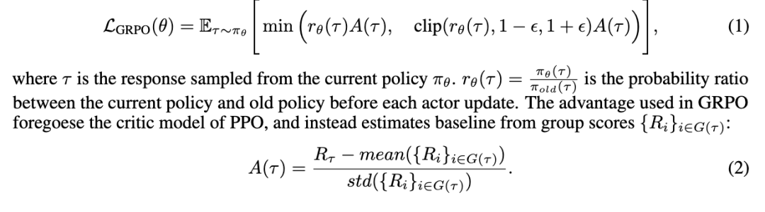 我们采用组相对策略优化(GRPO)[16]作为核心RL算法。与近端策略优化(PPO)[17]相比,它移除了价值模型,转而使用基于组分数的基线估计。形式上,GRPO最大化以下目标: