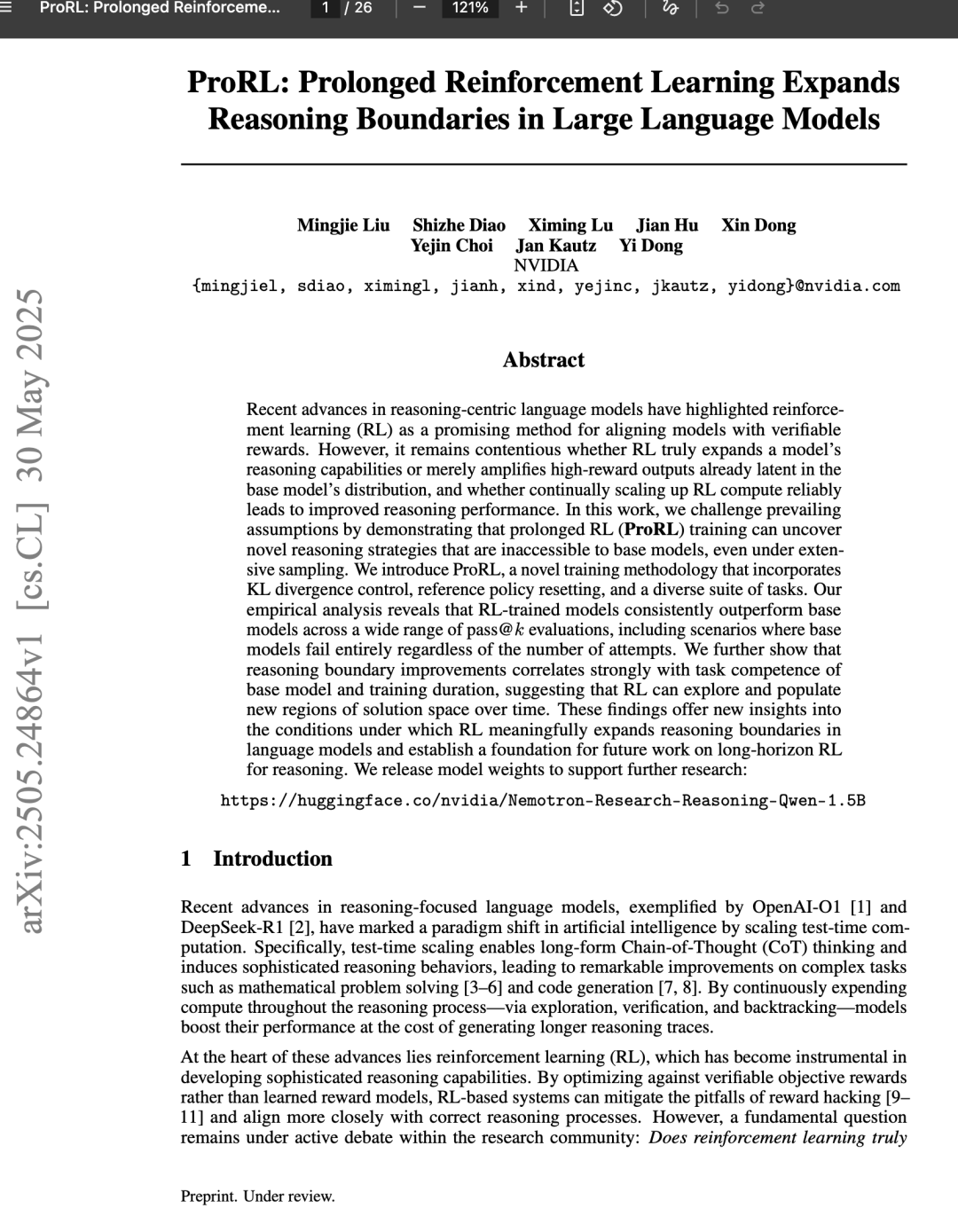 在本工作中,我们探讨了强化学习是否真正能扩展语言模型的推理边界。通过引入 ProRL,我们提供了令人信服的证据,表明延长且稳定的 RL 训练能够发展出超越基础模型初始能力的新颖推理模式。
