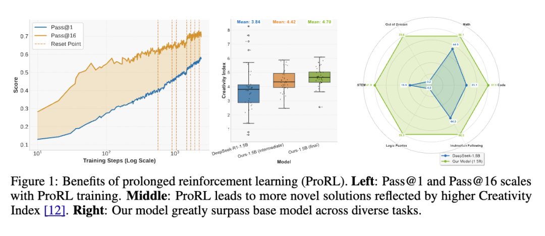 ProRL 结合了 KL 散度惩罚和周期性参考策略重置,以在长时间内保持训练稳定性。使用这一方法,我们开发了一个最先进的 15 亿参数通用推理模型,在涵盖数学、编程、STEM、逻辑谜题和指令遵循任务的多样化数据集上进行训练。我们的分析揭示,ProRL 在基础模型初始表现困难的任务上尤为有效。最重要的是,ProRL 实现了对分布外任务和日益复杂问题的强泛化能力,证明延长 RL 训练帮助模型内化可迁移到训练分布之外的抽象推理模式。
