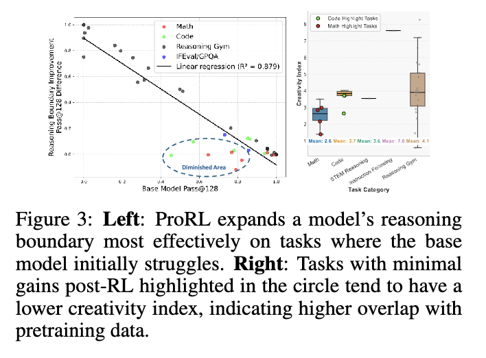 为了进一步证实我们的直觉——即RL后收益最小的任务是基础模型已经熟悉的任务——我们计算了基础模型对每个任务响应的创造力指数 [40],并与最大的开源预训练语料库DOLMA [41]进行对比。创造力指数量化了模型响应与预训练语料之间的重叠程度。圆圈中突出显示的一些数学和编程任务往往具有较低的创造力指数,表明基础模型在预训练期间已经见过大量类似数据。