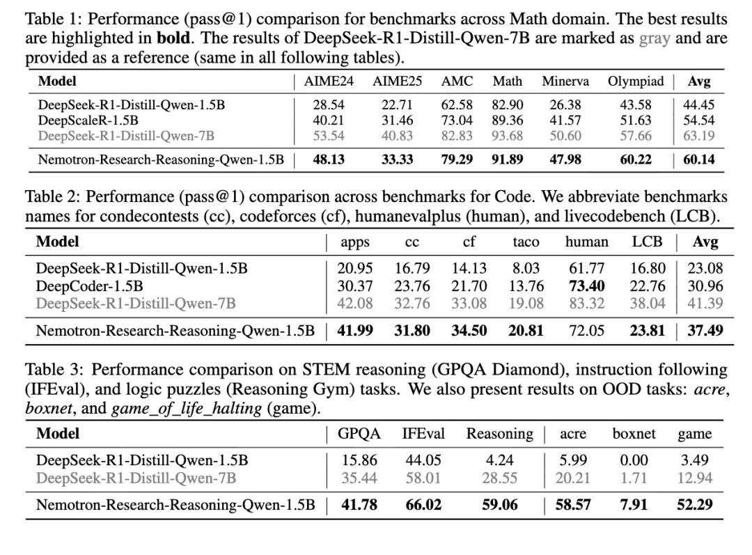 评估结果。 我们提供了DeepSeek-R1-Distill-Qwen-1.5B与我们最终模型Nemotron-Research-Reasoning-Qwen-1.5B在多个领域的详细对比。在表1所示的数学领域,我们的模型在各个基准测试上始终优于基础模型,平均提升15.7%。在表2所示的编程领域结果中,我们的最终模型在竞争性编程任务中以pass@1准确率超越基础模型14.4%。我们的模型在STEM推理和指令遵循方面也表现出显著提升,GPQA Diamond提升25.9%,IFEval提升22.0%。尽管基础模型在格式处理和具有挑战性的子任务上存在困难,但我们的模型在训练后在Reasoning Gym逻辑谜题上实现了高准确率,奖励提升54.8%。即使与更大的模型DeepSeek-R1-Distill-Qwen-7B相比,我们的模型在多个领域也达到了相当甚至更好的性能。