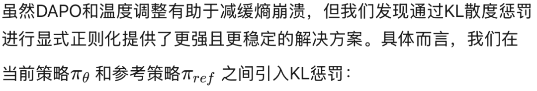 这一惩罚不仅有助于维持熵,还作为正则化器防止在线策略偏离稳定参考点过远,从而稳定学习并缓解对虚假奖励信号的过拟合。
