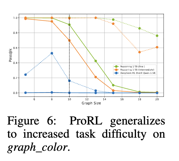 增加任务难度 我们通过生成具有不同节点数量的图问题,在graph_color任务(示例见附录C.1)的不同难度级别上评估性能。虽然训练数据仅包含大小为10的图,但我们在更大的图上进行测试以评估超出训练范围的泛化能力。图6绘制了不同模型的pass@1(实线)和pass@128(虚线)。结果显示,随着任务难度增加,性能持续下降,考虑到解空间的组合增长,这是预期的。然而,与基础模型和中间模型相比,我们的延长RL模型在所有图大小上保持了显著更高的准确率。这表明延长RL更新不仅提高了分布内任务的pass@1,还增强了模型对更复杂、未见过场景的鲁棒性。