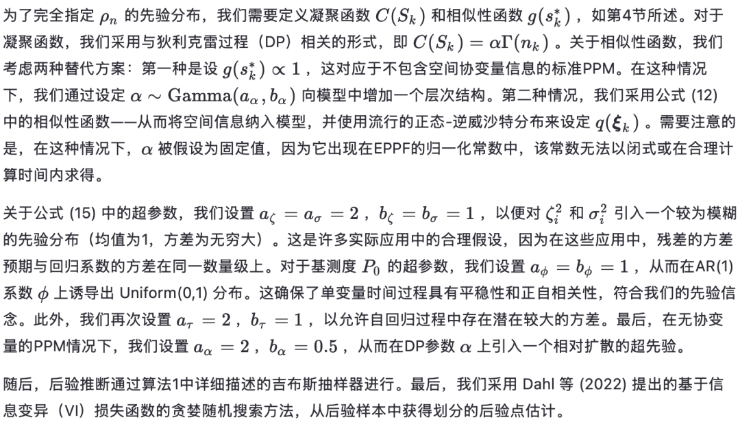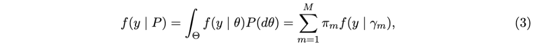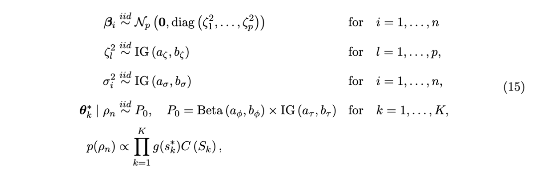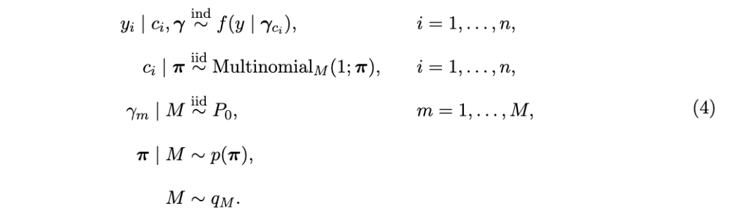 将方程 (3) 中的抽样模型置于贝叶斯框架下,需要对 P设置一个先验分布,即对一个几乎必然离散的概率测度设置先验。这一任务通常需要高级的概率工具,但由于引入了分配向量 c,模型设定可以被方便地简化如下:
