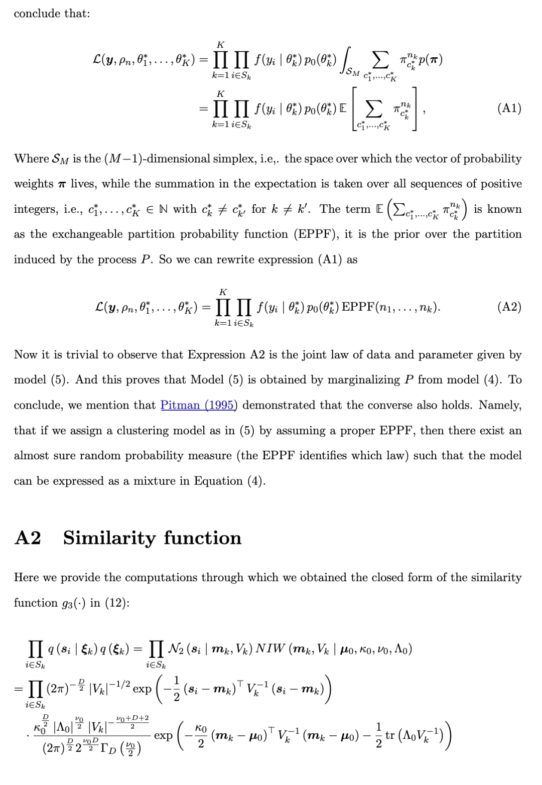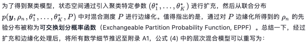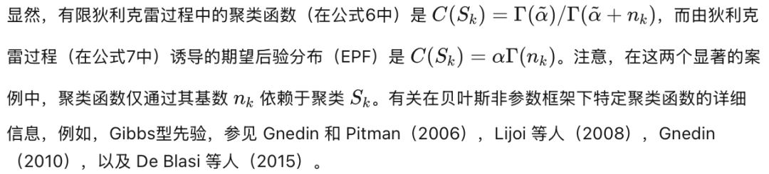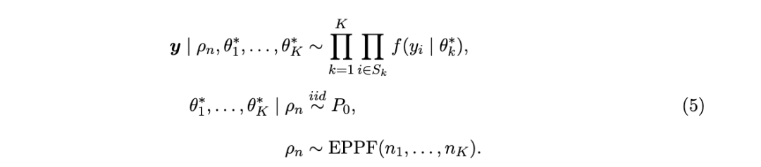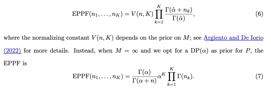 。此外,注意:对于一个合适的 EPPF,存在一个几乎必然离散的随机概率测度 P,称为物种采样模型(Species Sampling Model,Pitman, 1996),使得该模型可以表示为公式 (4) 的形式。