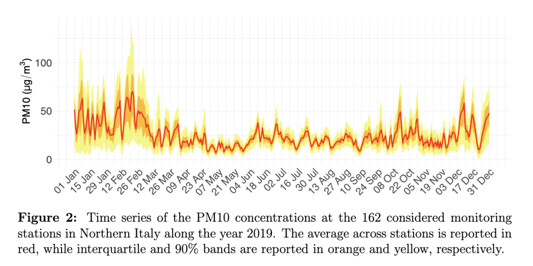 图2展示了2019年所有监测站点平均PM10浓度的时间序列,同时附有四分位距和90%置信带,以说明整体污染水平及其季节性模式。具体而言,PM10浓度在较冷月份达到峰值,数值频繁超过50 μg/m³,偶尔接近甚至超过100 μg/m³。这种季节性模式与冬季常见的已知因素相符,如取暖排放增加、大气扩散能力下降以及静稳空气条件(Pietrogrande等,2022)。相比之下,夏季则表现出较低的PM10浓度,通常低于50 μg/m³。图2中的置信带也显示出各监测站之间存在显著的变异性。
