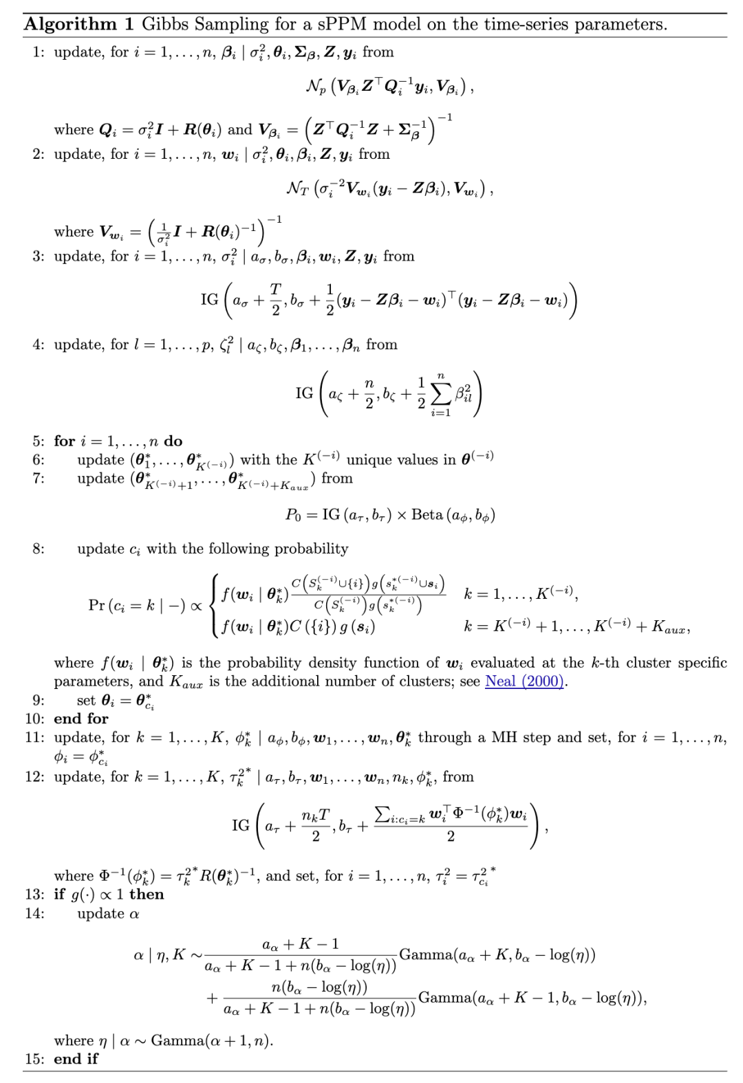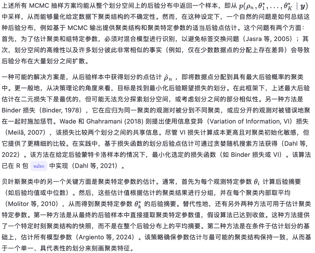 另一方面,无限混合模型的后验采样器可分为两类:(i) 条件算法,能够对混合参数和聚类结构进行完整的贝叶斯推断(Papaspiliopoulos 和 Roberts, 2008;Kalli 等, 2011);以及 (ii) 边缘算法,通过将混合参数积分掉来简化计算,从而专注于聚类本身(MacEachern 和 Müller, 1998)。早期进展包括引入 Pólya urn 吉布斯抽样器(Escobar, 1994;MacEachern, 1994;Escobar 和 West, 1995;MacEachern, 1998),随后 Ishwaran 和 James (2001) 引入了狄利克雷过程的断棒表示,使得可以通过吉布斯抽样实现后验推断。