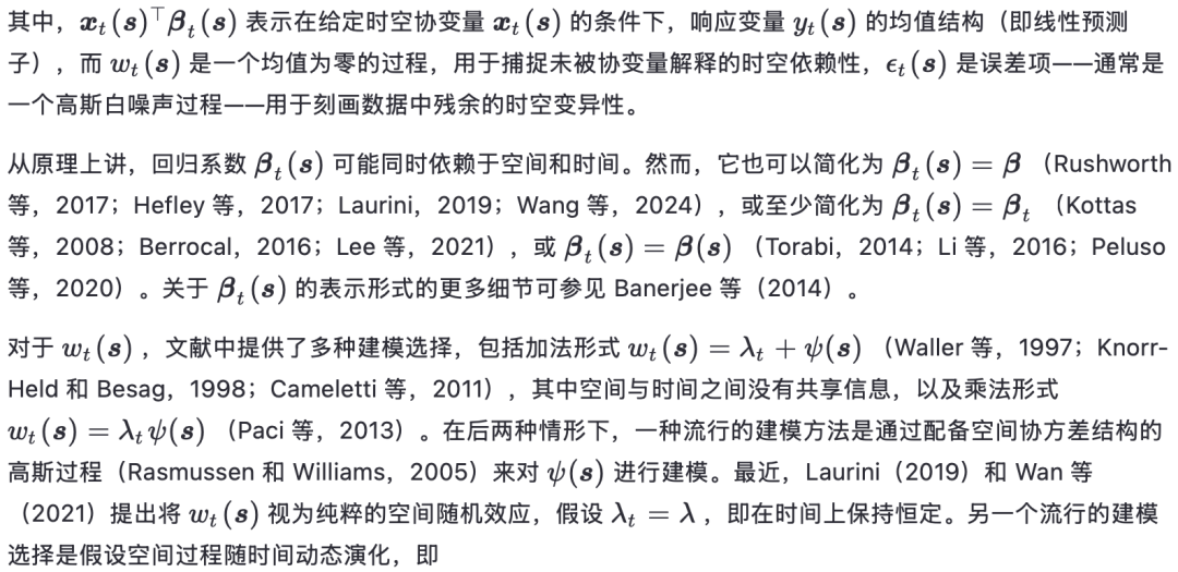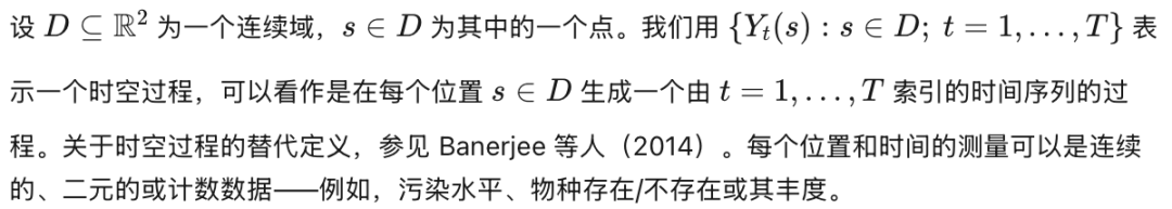 空气质量测量本质上具有时空特性,即在空间和时间两个维度上被记录。从空间维度来看,空间数据通常分为三类:点参照(地统计)数据,指在特定位置采集的测量值(例如,不同监测站的空气质量水平);面域(格网)数据,指在特定空间区域上聚合的测量值(例如,按行政区划统计的土地利用率);以及点模式数据,指事件在空间上的发生位置(例如,地震或野生动物出没的地点)。关于空间数据的全面概述,可参见 Banerjee 等(2014)和 Cressie 与 Wikle(2015)。时间维度也存在类似的区分,时间可被视为连续的(在 R+ 或其子区间上)或离散的(例如,每小时、每日等)。在后一种情况下,需明确每个测量值代表的是某一时间间隔内的计数或平均值(类似于空间数据中的面域测量),还是某一时刻的单点观测值。