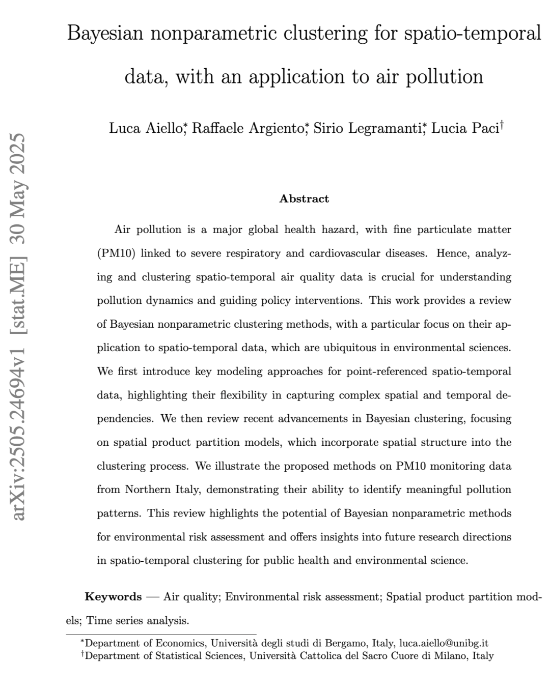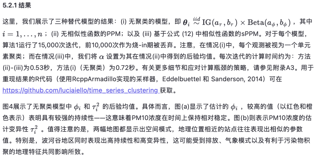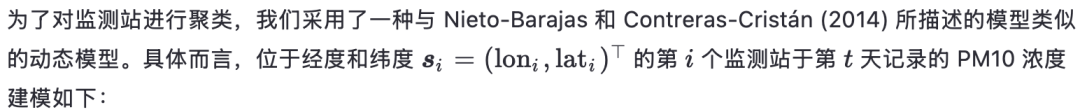 摘要 空气污染是一项重大的全球健康危害,细颗粒物(PM10)与严重的呼吸系统和心血管疾病密切相关。因此,分析和聚类时空空气质量数据对于理解污染动态并指导政策干预至关重要。本文综述了贝叶斯非参数聚类方法,特别关注其在环境科学中普遍存在的时空数据上的应用。我们首先介绍了针对点参照时空数据的关键建模方法,强调其在捕捉复杂空间和时间依赖性方面的灵活性。随后,我们回顾了贝叶斯聚类的最新进展,重点关注将空间结构融入聚类过程的空间乘积分区模型。我们以意大利北部的PM10监测数据为例,展示了所提出方法识别有意义污染模式的能力。本综述突显了贝叶斯非参数方法在环境风险评估中的潜力,并为公共健康与环境科学领域时空聚类的未来研究方向提供了见解。 关键词——空气质量;环境风险评估;空间乘积分区模型;时间序列分析