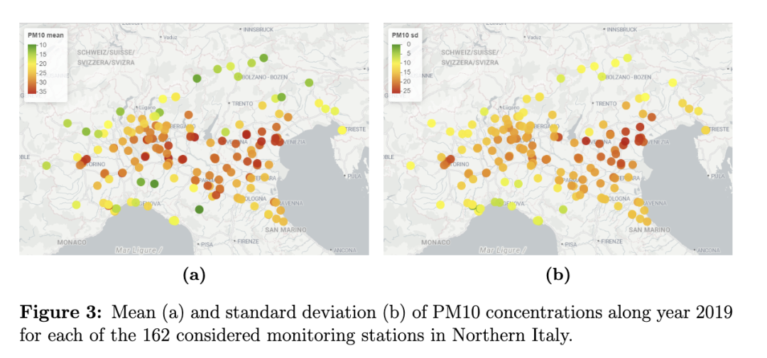 相反,图3展示了每个监测站点PM10浓度的均值和标准差。具体而言,图(a)显示最高均值(通常超过30 μg/m³)出现在都灵、米兰、布雷西亚、维罗纳和威尼斯等城市和工业区,而较低的均值浓度(低于20 μg/m³)则出现在北部和沿海地区。此外值得注意的是,南部波河谷地区的浓度处于中等水平,通常在20至30 μg/m³之间。通过对比图(a)和图(b),后者展示了每个站点的标准差,我们可以观察到:平均浓度较高的地区,特别是城市和工业区,往往也经历更大的时间波动。