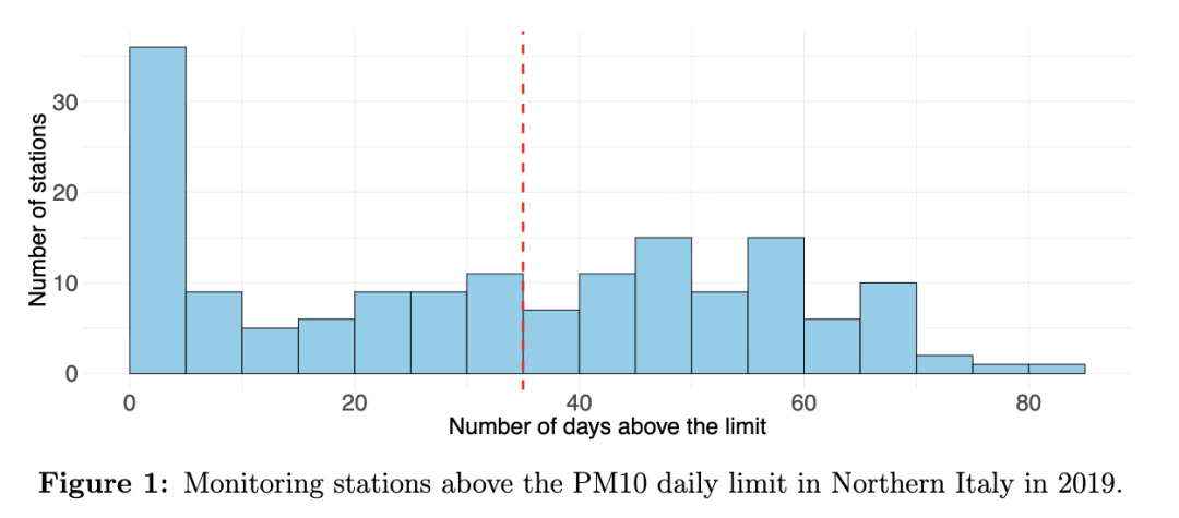 在本研究中,我们关注的数据集包含2019年1月1日至12月31日期间,意大利北部162个监测站每日测量的PM10浓度水平(即直径小于10μm的颗粒物)。该数据集由欧洲环境署(EEA)收集,并可免费获取于 https://eeadmz1-downloads-webapp.azurewebsites.net/。图1展示了这些监测站中有多少个超过了50μg/m³的浓度限值,以及超过该限值的天数。需要注意的是,根据EEA的规定(European Commission, 2008),每个监测站每年不应超过上述浓度限值超过35天。然而,在2019年,意大利北部162个监测站中有77个站点在超过35天的时间内超出了该限值。在一些受影响特别严重的区域,某些站点甚至记录到超过80天的超标情况。这凸显了意大利北部空气质量的严峻性,亟需进行细致的监测。该地区的空气污染——尤其是波河谷地区——是一个有充分文献记载的现象,其成因包括高密度的工业活动、城市区域以及位于被山脉环绕的平坦盆地中的密集畜牧业,这些因素阻碍了空气的有效交换(例如,Larsen等,2012)。