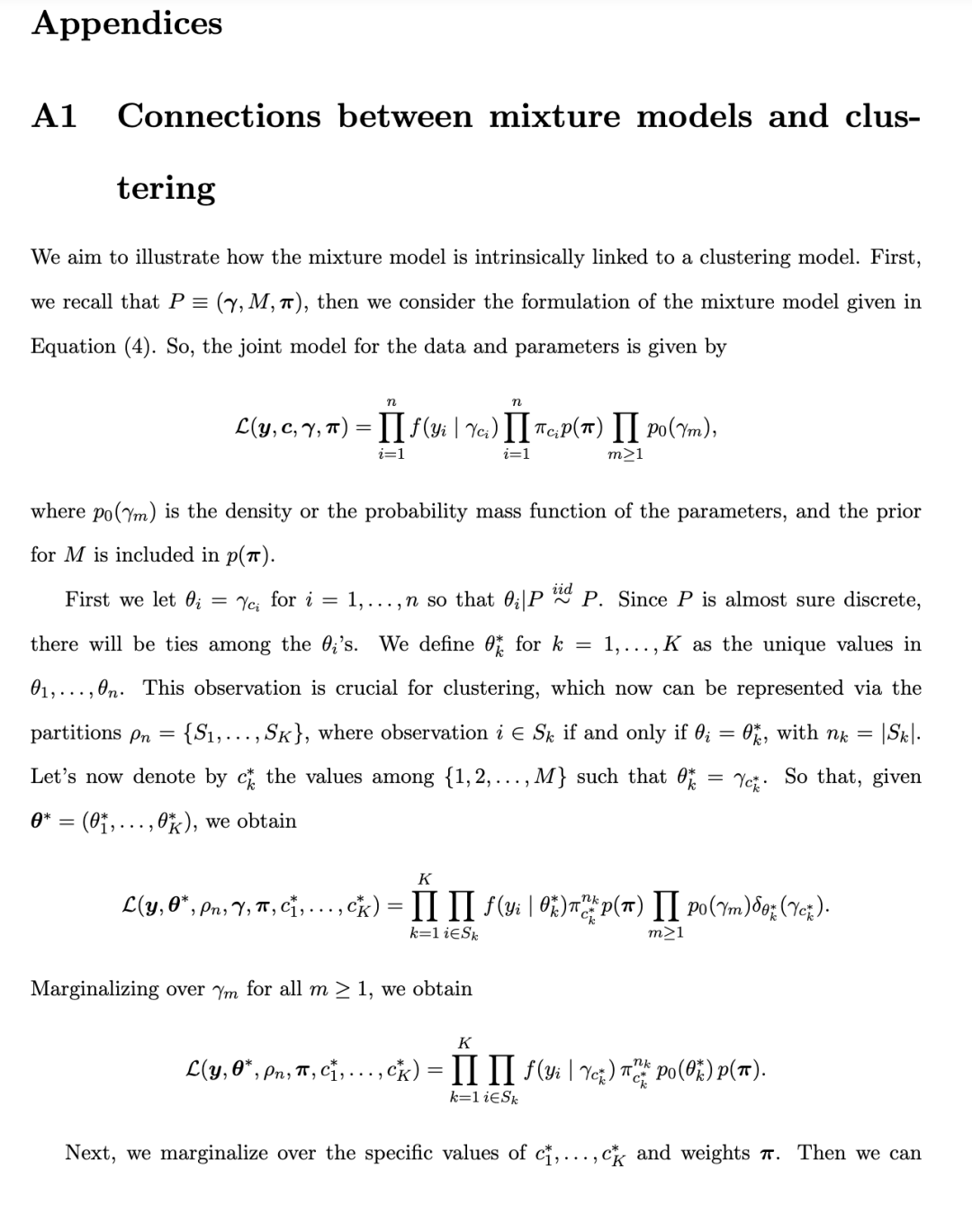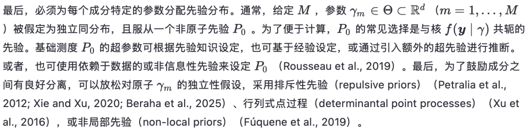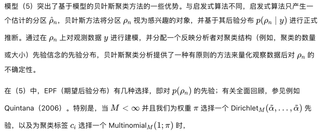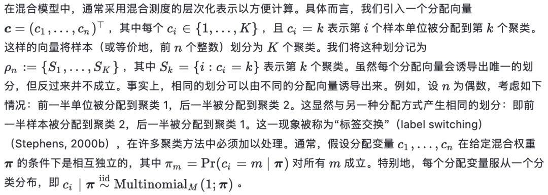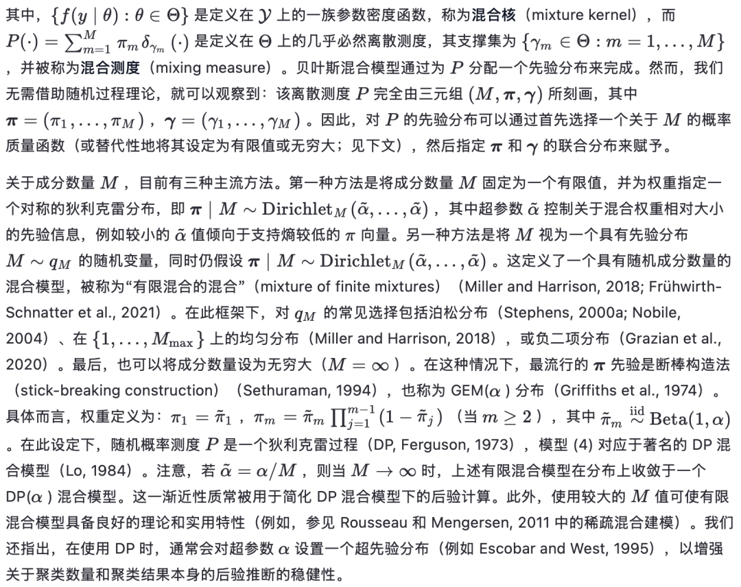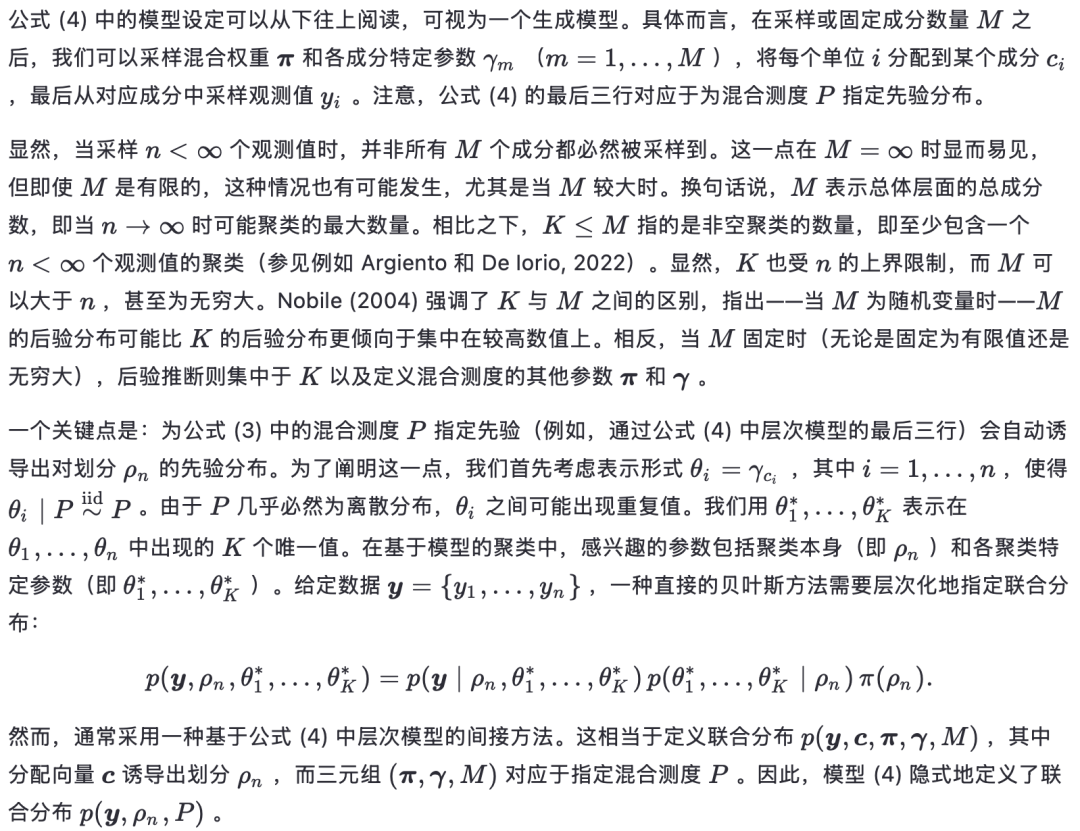 混合模型中的一个关键问题是确定成分的数量。这与确定聚类数量的问题相对应(下文将详细讨论聚类与成分之间的关系)。需注意,尽管对于大小为n的有限样本,最多只需n个组,但在总体层面上,原则上可以允许无限多个聚类。这使得统计聚类问题本质上是非参数的。类似地,在混合模型中,我们可以允许成分数量为无限,或为有限但随机,从而采用非参数方法。尽管无限混合模型在贝叶斯非参数领域已有长期研究,但直到最近,成分数量为随机的情况才被正式纳入非参数框架(Argiento 和 De Iorio, 2022)。在这两种情况下,混合模型都会在划分上诱导一个先验分布,使得在大样本极限下,聚类数量没有上界。此类先验中最著名的例子包括所谓的“有限混合的混合”(参见 Miller 和 Harrison, 2018),它假设成分数量有限但随机;以及狄利克雷过程(DP)混合模型(Ferguson, 1973;Lo, 1984),它允许无限多个成分。文献中还提出了许多其他灵活的推广形式;关于全面综述,可参考 Müller 等(2015)和 Frühwirth-Schnatter 等(2019)。
