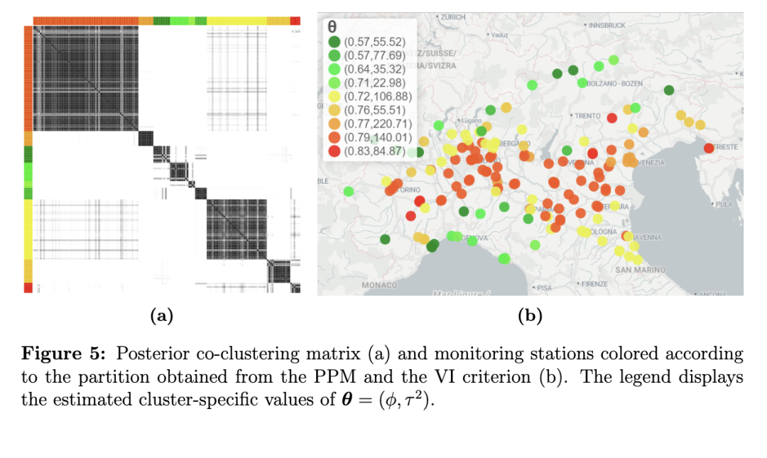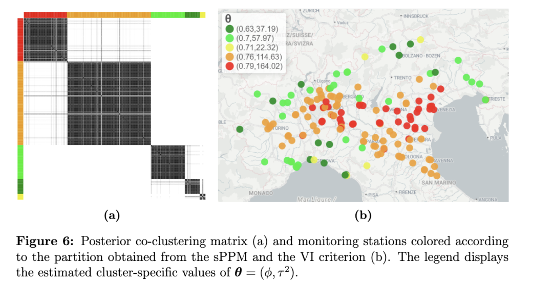 在聚类过程中引入相似性函数(即在sPPM框架下)所获得的结果如图6所示。图(a)中的共聚类矩阵反映出,与未包含空间协变量的PPM相比(即与图5的(a)部分相比),划分结构的不确定性进一步降低:聚类数量更少,且站点分配到聚类的不确定性也更低。图(b)展示了根据估计聚类结果着色的监测站分布,说明了引入相似性函数后,使得原本因靠近而被分配到不同聚类的监测站更倾向于被归入同一聚类。由此生成的地图揭示出三个明显不同的区域:波河谷中心区域(红色聚类)、阿尔卑斯山和亚平宁山脉周边地区(橙色聚类),以及沿海和山区(黄色至绿色聚类)——这些区域的持续性和变异性依次递减(仅有一个例外)。