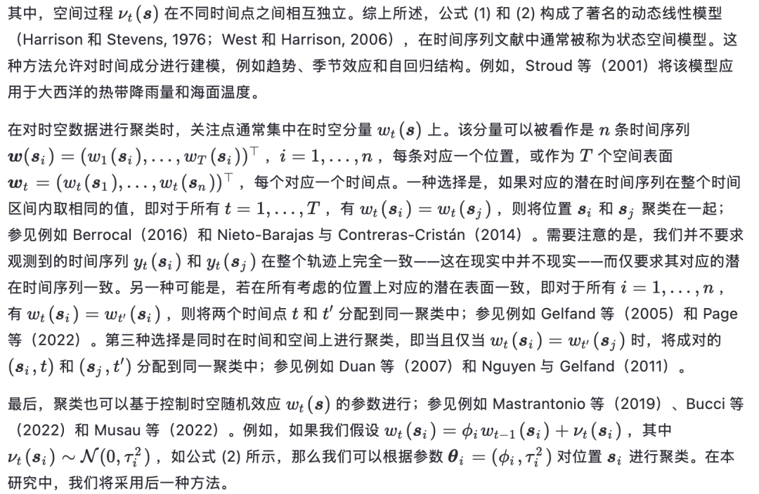 对于面域数据的聚类,Fernández 和 Green(2002)的开创性工作提出了一种具有随机成分数量的有限混合模型,并通过马尔可夫随机场对具有空间依赖性的混合权重进行建模。在时间序列聚类方面,Nieto-Barajas 和 Contreras-Cristán(2014)在状态空间框架内提出了一种贝叶斯非参数混合模型,而 Frühwirth-Schnatter 和 Kaufmann(2008)则提出了一种动态回归模型的有限混合模型。