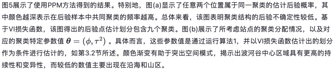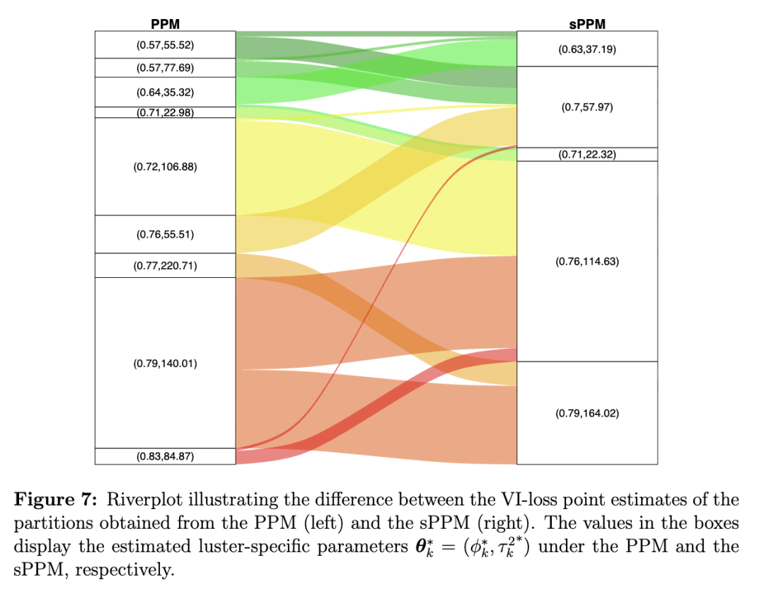 最后,图7中的河流图进一步展示了基于PPM(左侧)和sPPM(右侧)所得到的VI损失点估计划分之间的差异。颜色代表在PPM下形成的聚类,而框内标注的数字是通过以估计划分条件运行算法1计算得到的聚类特定参数。再次注意到,利用空间信息可得到更少的聚类(5个而非9个),从而形成更简洁、更具可解释性的聚类结构。