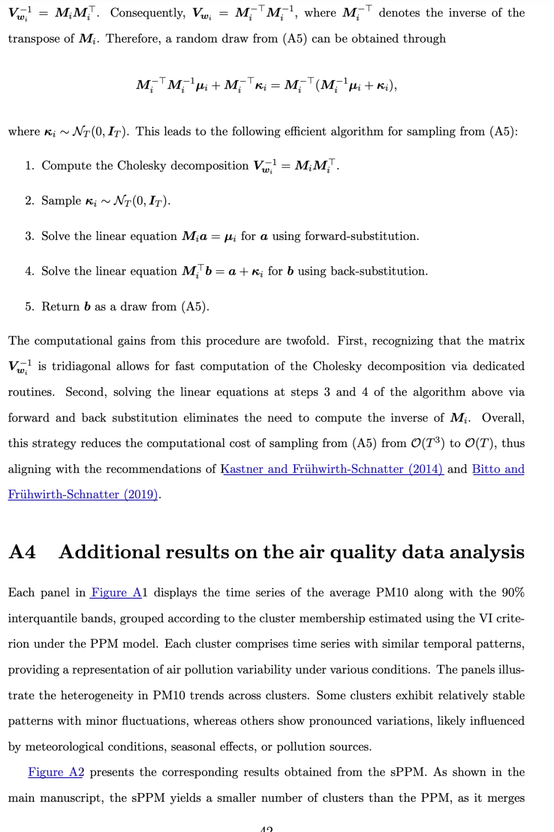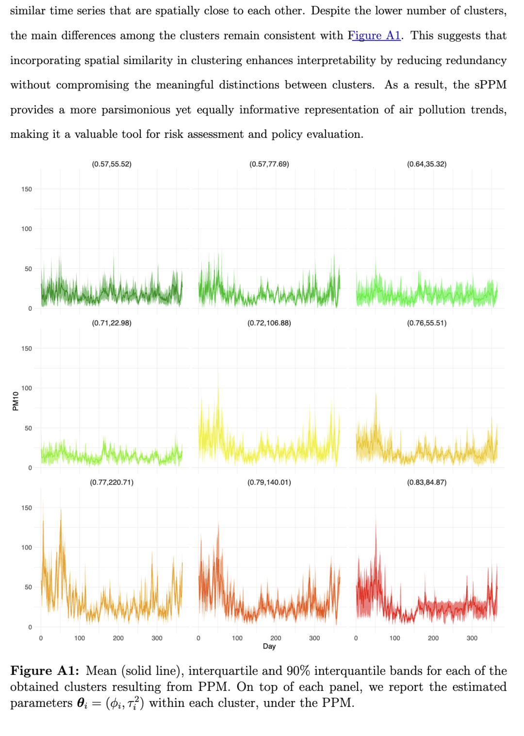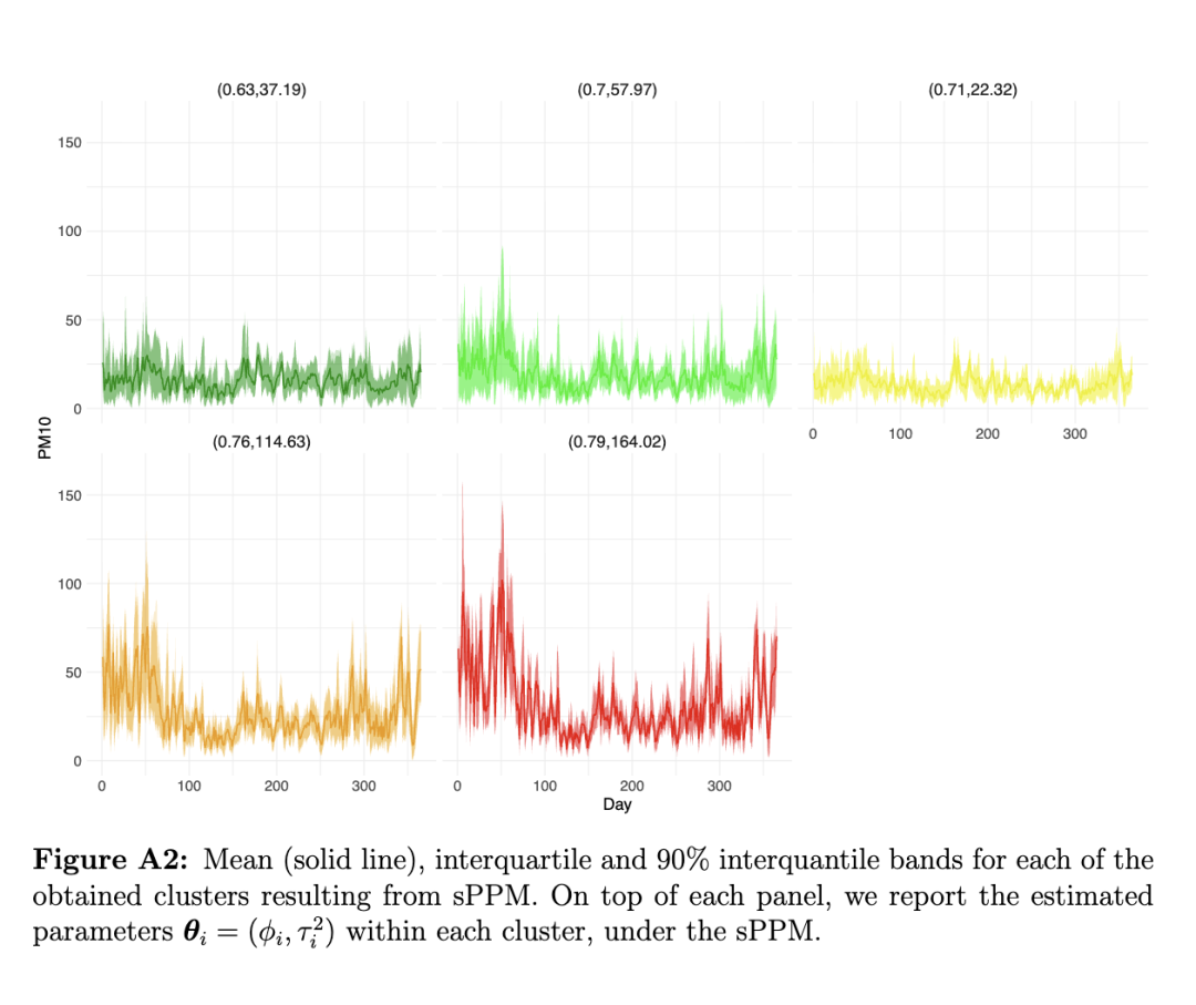 为了进一步说明我们聚类方法的结果,在附录(第A4节)中,我们展示了从PPM和sPPM分别得到的每个聚类的时间序列均值,以及四分位距和90%置信带。这些图表明,具有较高持续性和变异性特征的聚类对应于PM10污染水平更严重的区域,而持续性和变异性较低的聚类则通常记录到较为适中的PM10浓度。