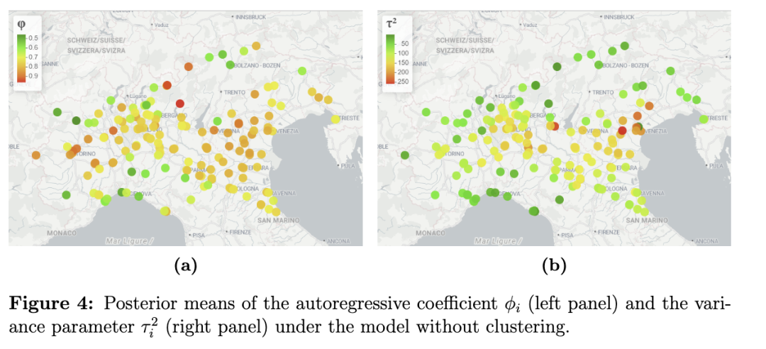 具体而言,在本文的应用研究中,我们采用了一个多层次的分层线性混合模型,引入一阶自回归过程以刻画时间效应,并将具有相同自回归系数和时间方差的时间序列聚类在一起。随后,我们通过sPPM框架引入地理坐标,对非参数模型进行了扩展,以在聚类过程中诱导空间同质性。