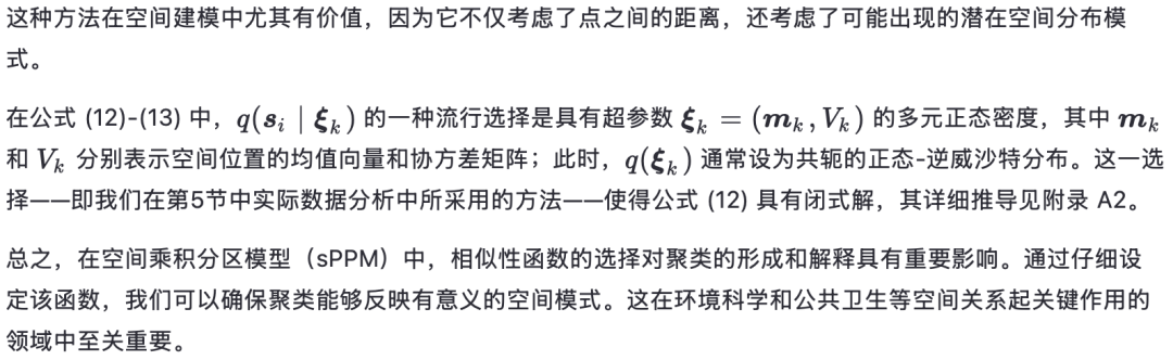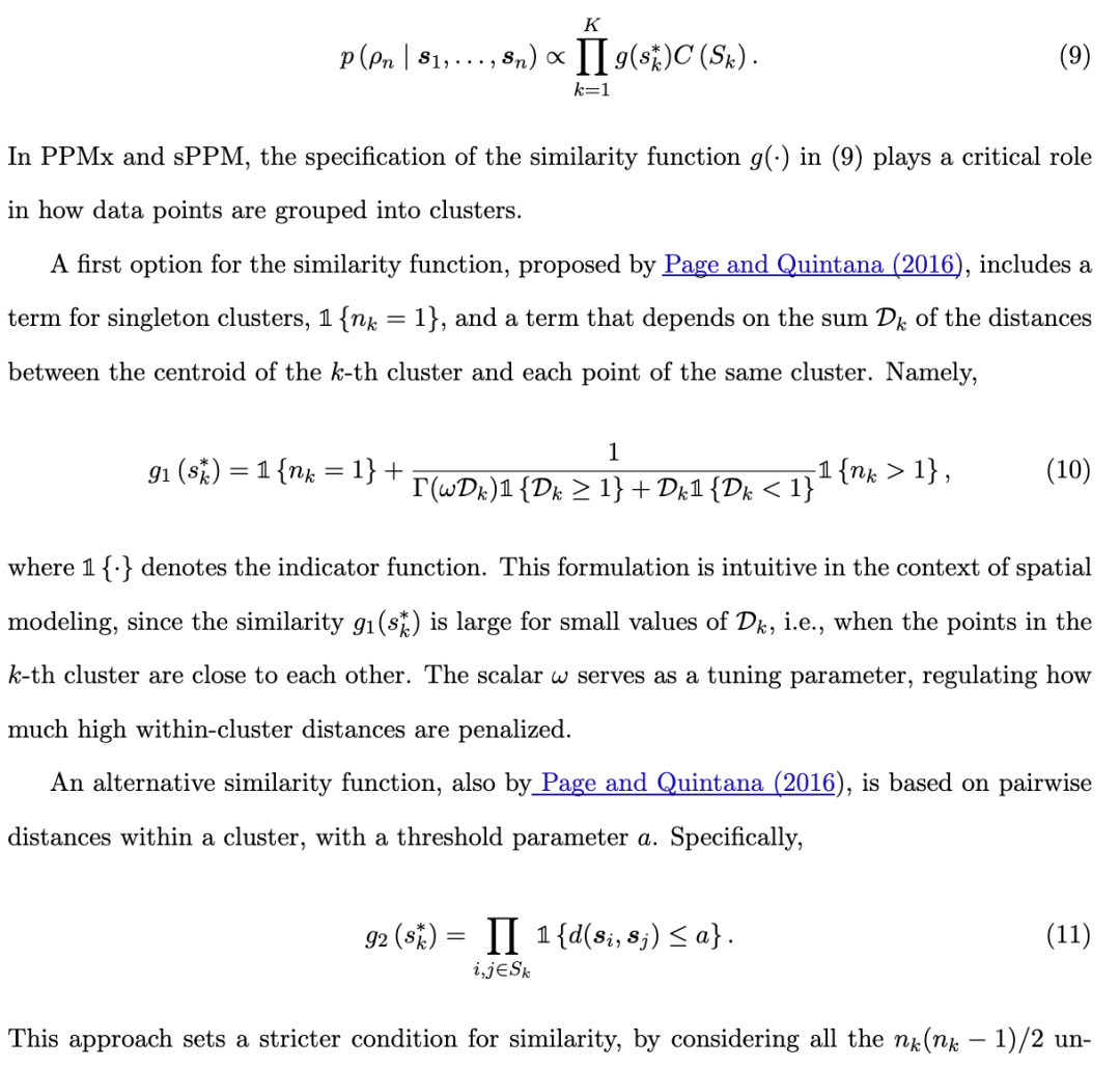 在对空间点参照数据进行聚类时,一种突出的贝叶斯非参数方法是空间狄利克雷过程(Spatial Dirichlet Process,Gelfand 等,2005),它表现为一系列以概率加权的随机空间曲面的集合。Duan 等(2007)通过引入空间依赖的混合权重对该模型进行了推广。然而,这两种空间狄利克雷过程都需要在每个空间位置上有多次观测。作为替代方案,空间断棒过程(spatial stick-breaking process,Reich 和 Fuentes,2007;Rodríguez 和 Dunson,2011)允许聚类分配概率随空间变化,而无需重复观测。此外,Nguyen 和 Gelfand(2011)提出了狄利克雷标记过程(Dirichlet labeling process),作为一种灵活的空间聚类模型。尽管这些方法非常有吸引力,但当存在可用于辅助聚类识别的协变量时,其性能可能受到限制。