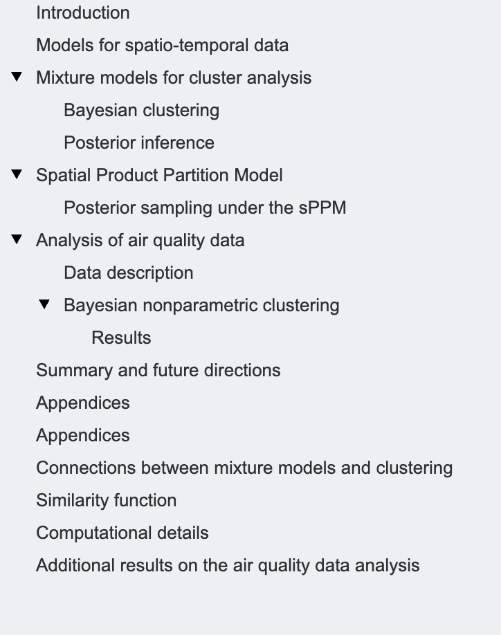 本文其余部分结构如下:第2节和第3节概述了用于聚类分析的混合模型,重点关注时空数据和贝叶斯非参数方法。特别地,在第4节中,我们详细讨论了乘积分区模型(Product Partition Models, PPM,Hartigan, 1990)及其在时空场景下的扩展。随后,我们在真实世界空气质量数据上展示了该方法的应用(第5节),旨在突出此类技术在所有涉及时空数据的应用中的广泛适用性。最后,第6节提出总结性评述及未来研究方向,强调贝叶斯非参数方法在环境数据科学中的巨大潜力。