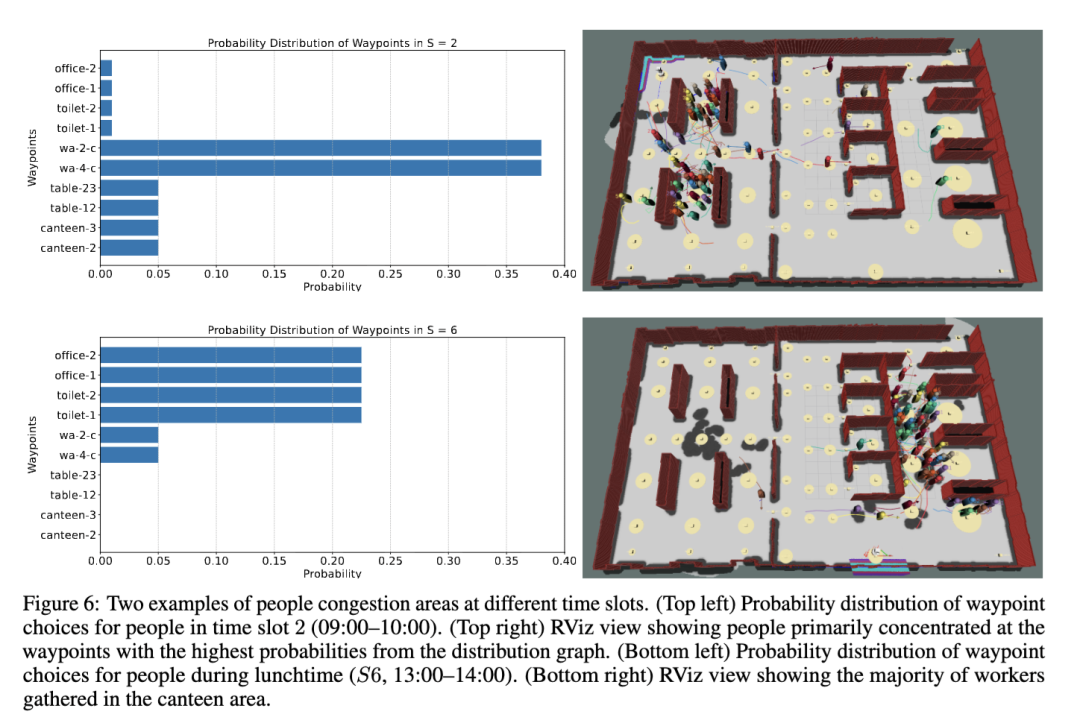 一些拥堵区域(图7中以红色人群图标表示)对应于被占据概率最高的航路点。但工人仍有一定概率前往其他位置,即图7中以白色圆圈表示的非拥堵区域。这模拟了工人自然的行为模式,例如休息、上厕所、去食堂,或偶尔离开其主要工作区域前往其他地点。