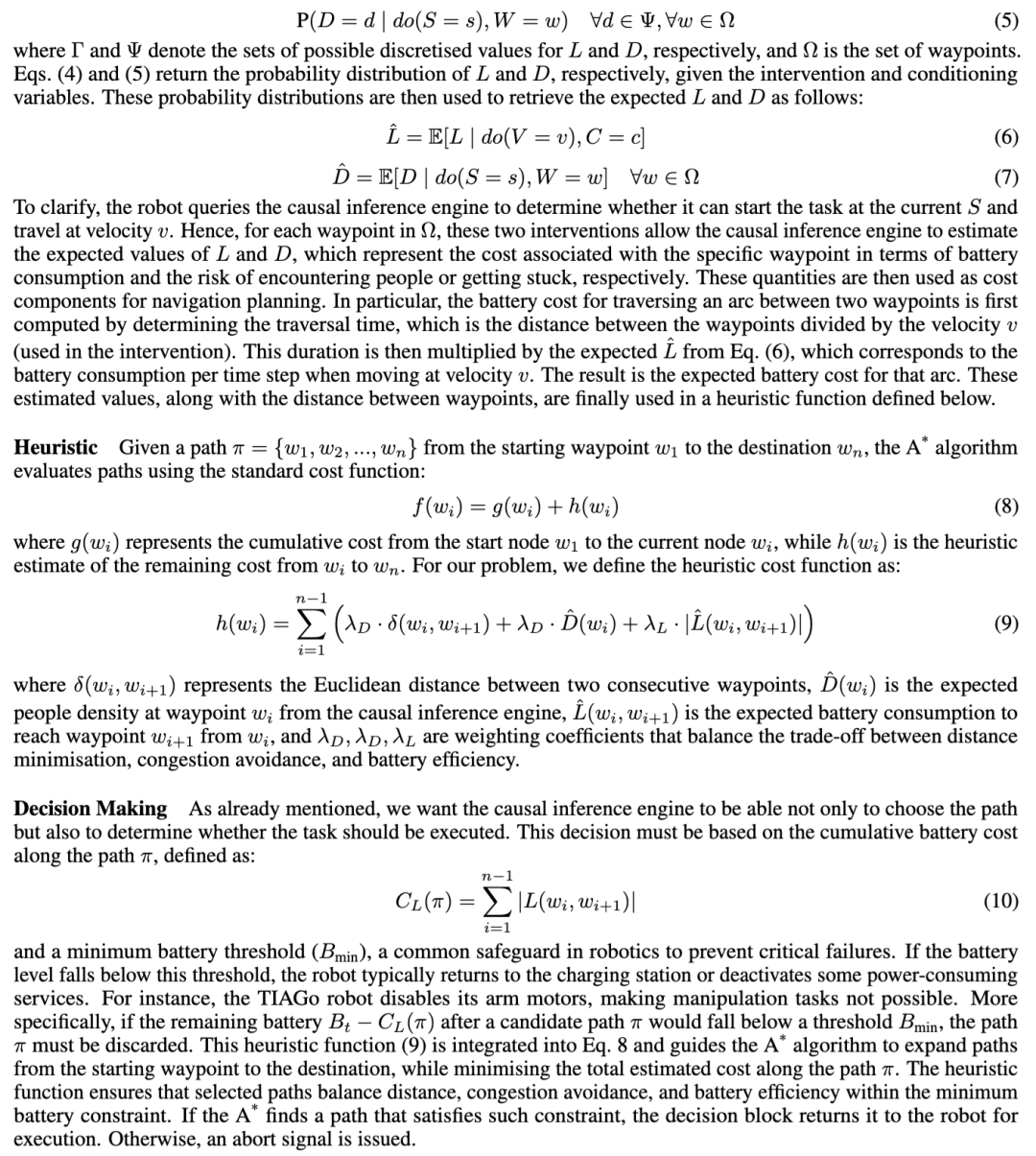 机器人的查询被表述为一种干预,代表其为完成任务而考虑采取的某个行动(例如,“如果我执行动作X会怎样?”)。通过此前已学习得到的因果推理引擎,推理流程会评估该行动可能带来的后果,即估计在实施该干预或特定条件下,相关因素将如何发生变化。此过程的输出是所查询因素的条件概率分布,该分布考虑了因果模型内部的因果关联。这一推理步骤再次借助 pyAgrum⁵ 完成,该工具为此步骤提供了对 do-演算(do-calculus)[48] 的完整实现 [49]。随后,通过计算该推理出的概率分布的期望值,得到该因素的估计值。该估计值最终被嵌入到 A* 算法所使用的启发式函数中,以确定机器人的行进路径。若在特定条件下找到了一条有效路径,推理流程将返回继续执行任务并采用所选路径的决策;相反,若未找到有效路径,则向机器人返回中止任务的信号。这些步骤构成了推理流程,如图2所示。