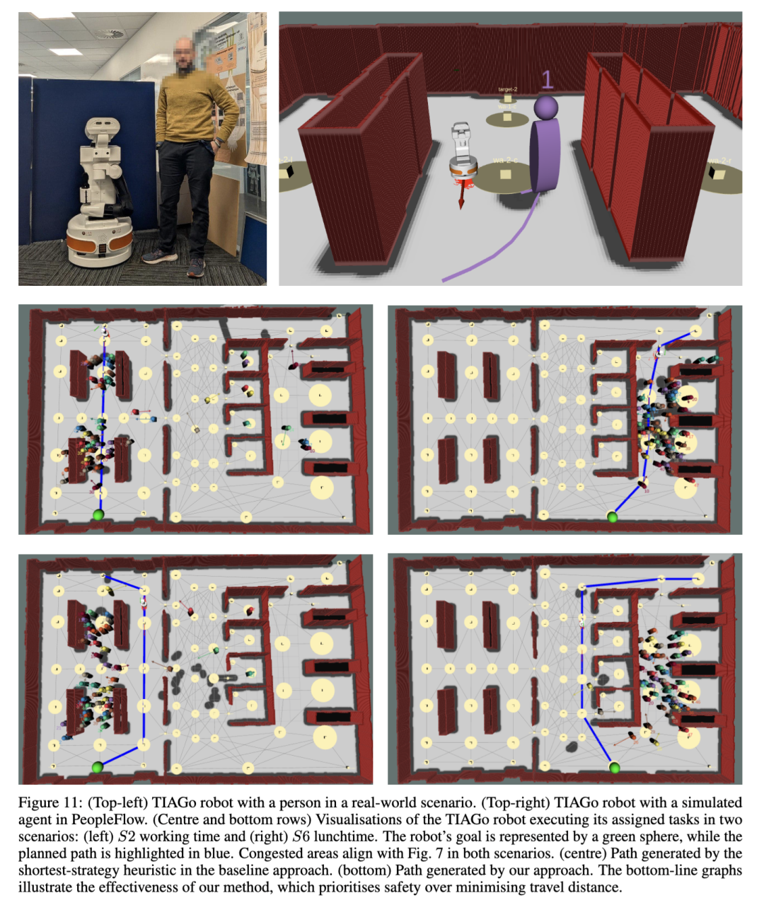 效率分析图9(左上)显示,采用我们基于因果性的决策框架的TIAGo机器人成功完成了89%的任务(2090个任务中的1860个),而基线方法仅完成55.9%。这一差异也体现在因拥堵(橙色)和电池耗尽(红色)导致的失败率上。具体而言,与基线方法相比,我们的方法中由拥堵引起的失败比例仅为10.9%,而基线方法高达43.8%。这表明,对人员密度(D)和电池消耗(L)的估计使机器人能够成功完成近90%的任务,而基线方法由于缺乏这些信息,在近一半的情况下任务失败。图11中的实验示例展示了一个典型场景:TIAGo使用我们的方法成功避开拥堵区域并完成任务;相比之下,基线方法优先选择最短路径——即使该路径最为繁忙——导致机器人陷入拥堵,最终造成任务失败。