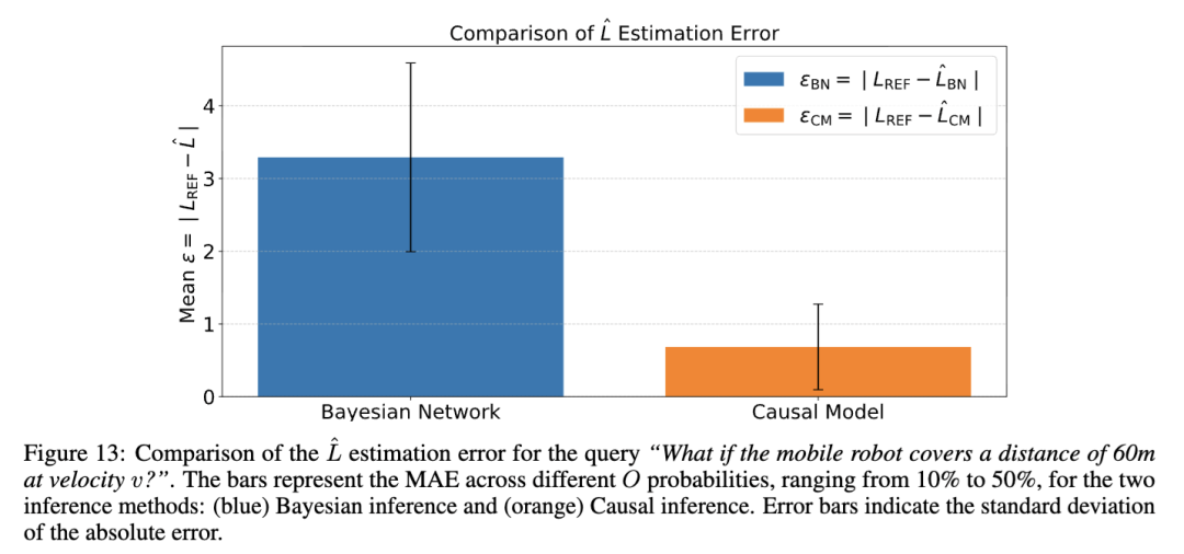 为了推广,我们改变了障碍物概率在10%到50%之间,以10%的增量进行,并比较了两种推理方法。图13显示了两种推理方法(蓝色)贝叶斯推理和(橙色)因果推理在不同 O 概率(即10%、20%、30%、40%、50%)下的均值绝对误差(MAE),误差条表示标准差。这一比较表明,平均而言,因果模型在各种障碍物概率下的推理准确性优于贝叶斯网络。