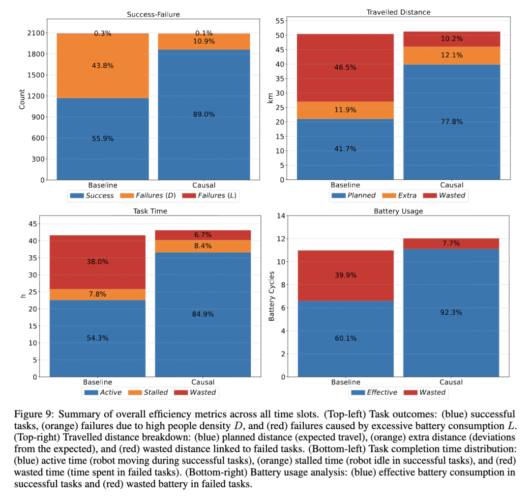 最后,图9(右下)中的电池消耗结果显示,尽管我们的因果方法成功完成的任务数量远多于基线方法,但两者所需的电池循环次数几乎相当(因果方法为12次,基线方法为11次)。事实上,因果方法对电池的管理显著更优:其92.3%的电池消耗被归类为“有效”——即用于最终成功的任务,仅有7.7%浪费在失败任务上。相比之下,基线方法有39.9%的电池消耗被浪费在失败任务上,相当于超过4个完整的电池循环。
