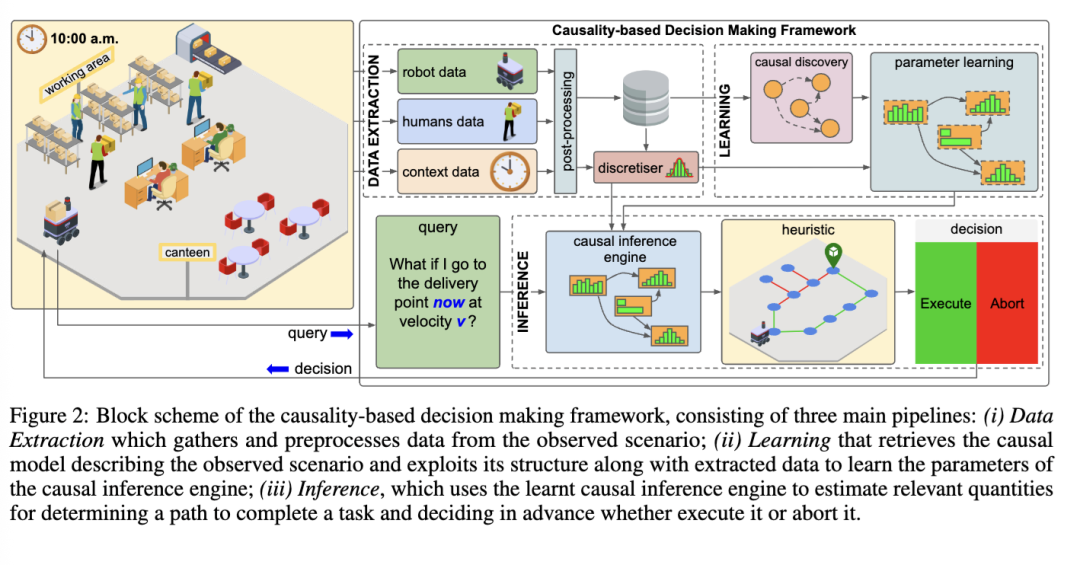 学习阶段包括因果发现和参数学习两个部分。首先,该阶段致力于揭示工作环境中支配人类与机器人行为的潜在因果关系。一旦因果结构被识别出来,便对模型参数进行估计,从而能够基于所获取的因果关系进行推理。