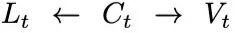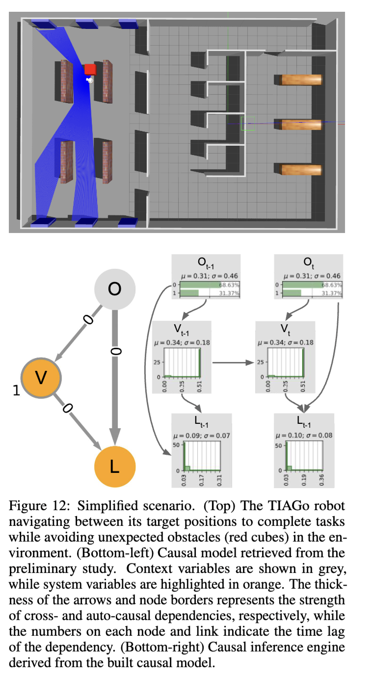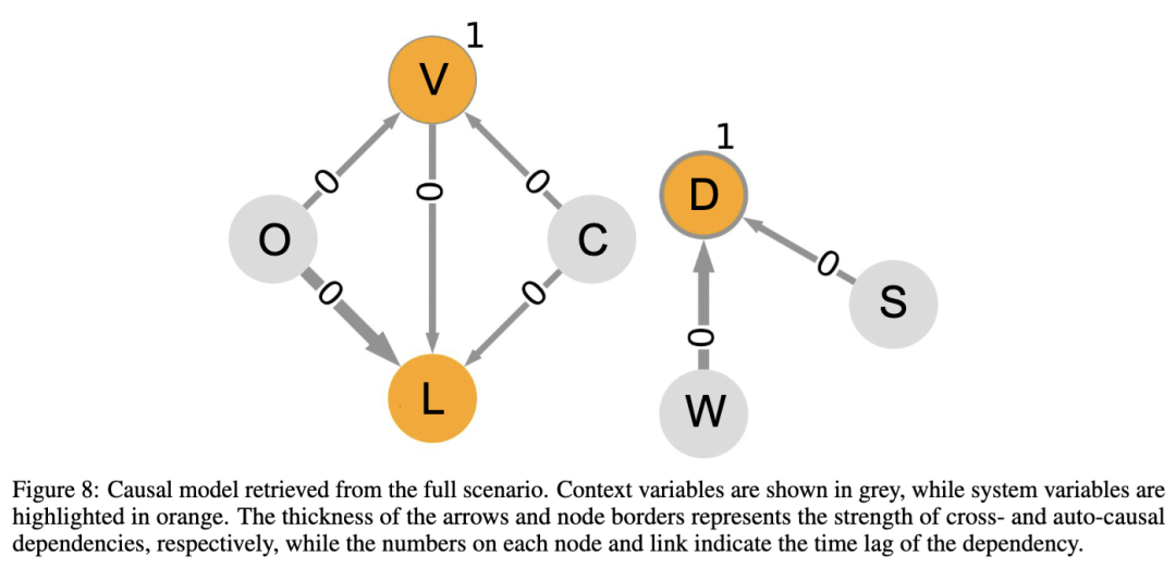 如图12(左下)所示的因果模型,由J-PCMCI+算法发现。由于存在上下文变量 O,且假设为一阶马尔可夫过程(即一步时间滞后),因此选用该算法。该模型本质上是图5中先前模型的简化版本,仅针对本场景中涉及的 V、L 和 O 三个变量进行建模(由于仅考虑 C = 0 的情况,因此