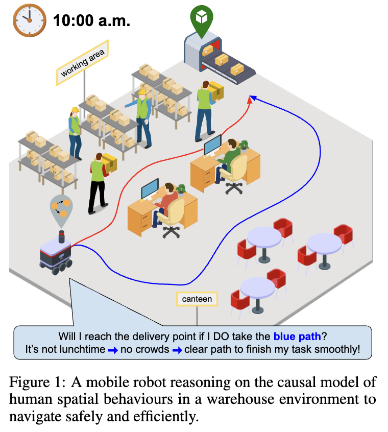 例如,考虑图1所示的一个在人类共用的仓库中的移动机器人。机器人必须到达目标位置,同时需考虑人类在共享空间中的行为方式,并结合环境布局和其他上下文因素(如一天中的时间)。发现这些因素之间的因果关系,使机器人能够对它们进行推理,从而理解驱动人类行为的机制,并基于因果知识做出决策。如图1所示,得益于其因果模型,机器人推理出:尽管穿过食堂的路径比直接穿过工作区的路线更长,但由于当前并非午餐时间,食堂人较少,因此这是最安全且最高效的路径。通过选择此路径,机器人可以高效抵达目标位置,最大限度减少意外障碍物以及与人类发生碰撞的风险。