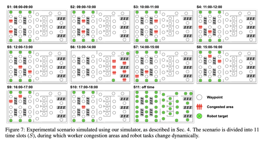模拟场景 我们设计了11种不同的场景,涵盖不同的工人拥堵区域和机器人任务,如图7所示。这些场景对应一天中的11个不同时间段(S1–S11),反映了工人活动在现实中的变化情况。在每个时间段,我们为各个航路点(Ws)设置了更高的被工人占据的概率,以模拟一天中不同时段工人在指定区域执行特定任务的现象。例如,在S1–S5和S7–S10期间,工人处于正常工作状态,主要集中在货架区和办公室等作业区域。S6代表午餐时间,此时工人集中在食堂区域。最后,S11模拟非工作时段,此时工人通常已离开仓库。