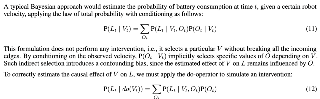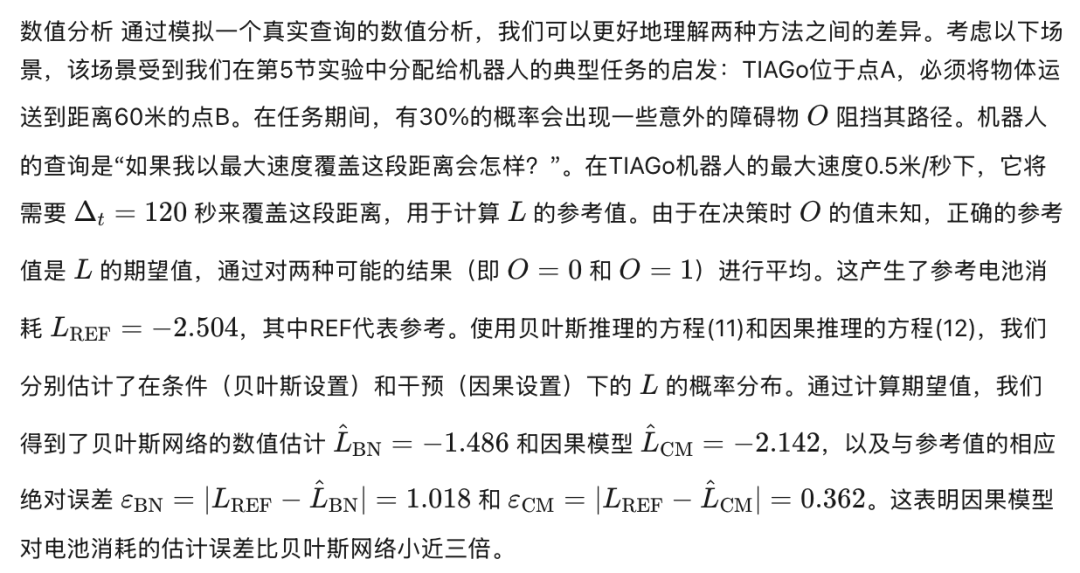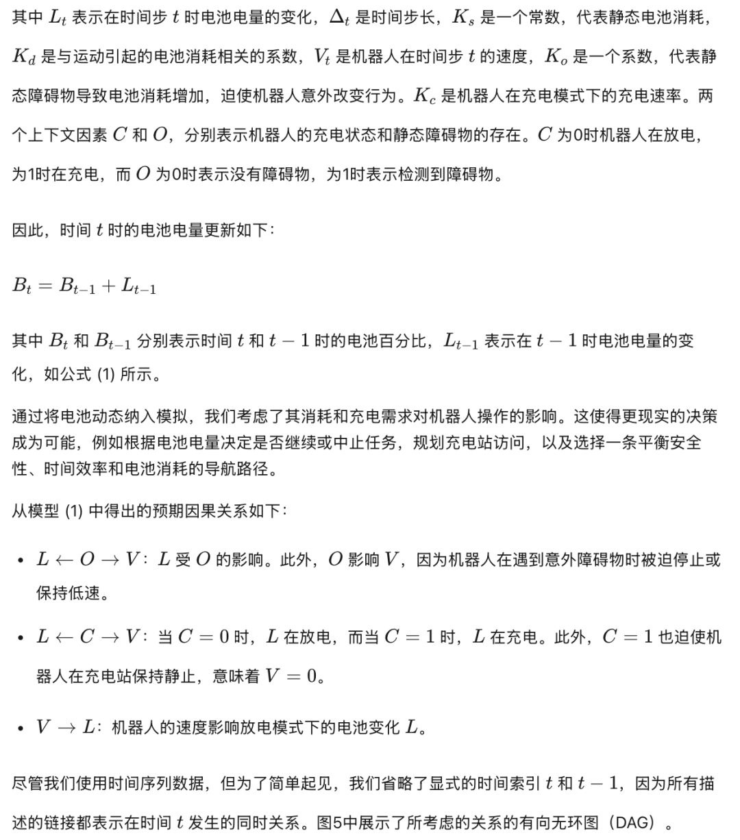 如第4.1节所述,因素 O 代表环境中出现的意外静态障碍物,它同时影响机器人的速度 V 和电池消耗量 L。因此,O 是变量 V 和 L 之间的混杂因素。在我们的场景中,如第3.3节所述,机器人被分配一项任务,并向因果推理引擎发起查询,以根据当前电池电量决定是否启动或中止该任务。因此,需要对速度 V 进行干预,以在任务开始前估计电池消耗量 L。然而,机器人无法预先知道其路径上是否会遇到意外障碍物。因此,在决策时刻,我们无法直接对混杂因素 O 进行条件化(即无法获知其取值)。如果忽略这一依赖关系,将导致对因果效应的估计产生偏差。相反,通过对 O 进行调整(adjusting for O),我们可以分离出 V 与 L 之间的真实因果关系,从而在不确定性场景下更准确地估计电池消耗量。